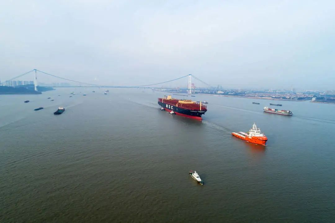 ▲“鑫福90”從泰興揚子鑫福船廠碼頭離岸試航。這艘比遼寧號航空母艦還要長30米的巨輪,從長江駛向遼闊海洋。