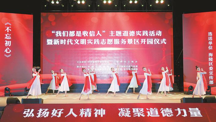 新時(shí)代文明實(shí)踐志愿服務(wù)景區(qū)昨日開(kāi)園 節(jié)目《不忘初心》。 方雨婷攝 今天是我國(guó)第20個(gè)公民道德宣傳日。昨晚,“我們都是收信人”主題道德實(shí)踐活動(dòng)暨新時(shí)代文明實(shí)踐志愿服務(wù)景區(qū)開(kāi)園儀式舉行,市委常委、宣傳部部長(zhǎng),副市長(zhǎng)劉霞出席活動(dòng)。 8月13日,習(xí)近平總書(shū)記給“中國(guó)好人”李培生、胡曉春的回信,引發(fā)全國(guó)各地?zé)崃曳错憽樯钊雽W(xué)習(xí)貫徹習(xí)近平總書(shū)記重要回信精神,結(jié)合第20個(gè)公民道德宣傳日系列宣傳活動(dòng),市委宣傳部、市文明辦舉辦“我們都是收信人”主題道德實(shí)踐活動(dòng)暨新時(shí)代文明實(shí)踐志愿服務(wù)景區(qū)開(kāi)園儀式,激勵(lì)和引導(dǎo)全市干部群眾在平凡工作中創(chuàng)造不平凡的業(yè)績(jī),爭(zhēng)做社會(huì)的好公民、單位的好員工、家庭的好成員,為實(shí)現(xiàn)中華民族偉大復(fù)興奉獻(xiàn)自己的光和熱。 “八月的黃山,收到了來(lái)自中南海的回信,一字一句,是那樣情真意切、質(zhì)樸而溫馨。你聽(tīng),那洪亮的聲音,翻山越嶺,縈繞在江南塞北、城市鄉(xiāng)村;你聽(tīng),那殷切的期盼,如春風(fēng)化雨,蕩滌著我們每個(gè)人的心靈。從那一刻開(kāi)始,整個(gè)中國(guó)都在用心聆聽(tīng),所有的中華兒女,都是收信人!”活動(dòng)從群誦《我們都是收信人》開(kāi)始。聽(tīng),“我們都是收信人”的集結(jié)號(hào)角已然吹響。從今天起,市委宣傳部、市文明辦將在全市開(kāi)展“我們都是收信人”主題道德實(shí)踐活動(dòng)暨公民道德宣傳日系列活動(dòng),推動(dòng)全市精神文明建設(shè)再上新臺(tái)階。 危難時(shí)刻逆行而上,青春在烈火中永生的消防員“中國(guó)好人”朱軍軍;扎根郵政基層四十年、“信”守民心的道德模范何健忠;三次援藏支教,被稱(chēng)為“雪域阿爸”的“中國(guó)好人”錢(qián)維勝;即使自己命懸一線,也要先救助病人的道德模范胡方斌……活動(dòng)現(xiàn)場(chǎng),一個(gè)又一個(gè)動(dòng)人故事的深情講述,觀眾們仔細(xì)聆聽(tīng)“泰州好人”的故事,汲取榜樣的力量。 值得一提的是,為講好泰州道德模范、身邊好人的動(dòng)人故事,激勵(lì)和引領(lǐng)更多的市民見(jiàn)賢思齊、崇德向善,市委宣傳部、市文明辦組建“泰州榜樣”道德故事宣講團(tuán),深入各地新時(shí)代文明實(shí)踐中心(所、站)和基層一線進(jìn)行宣講,讓人們學(xué)有榜樣、行有示范。昨天,正是“泰州榜樣”道德故事巡回宣講首場(chǎng)演出。活動(dòng)中,劉霞為“泰州榜樣”道德故事宣講團(tuán)授旗。 近年來(lái),我市涌現(xiàn)出33人(組)道德模范、85人(組)“中國(guó)好人”。一個(gè)典型就是一面旗幟,一個(gè)模范就是一座豐碑,在先進(jìn)典型的引領(lǐng)下,泰州的新時(shí)代文明實(shí)踐不斷走深走實(shí)。去年,全省首個(gè)文明實(shí)踐志愿服務(wù)街區(qū)在海陵區(qū)鐘樓巷誕生。昨天,全省首個(gè)新時(shí)代文明實(shí)踐志愿服務(wù)景區(qū)在天德湖公園正式開(kāi)園。劉霞與姜堰先鋒公益發(fā)展促進(jìn)會(huì)會(huì)長(zhǎng)、“中國(guó)好人”、省道德模范馬曉兵一同為天德湖新時(shí)代文明實(shí)踐志愿服務(wù)景區(qū)揭牌。天德湖新時(shí)代文明實(shí)踐志愿服務(wù)景區(qū),包含美德善行園、科技科普館、文明講堂、非遺傳承館、讀書(shū)吧等系列文明實(shí)踐志愿服務(wù)點(diǎn),它將志愿服務(wù)、游園文化等有機(jī)結(jié)合,將成為宣傳群眾、教育群眾、引領(lǐng)群眾、服務(wù)群眾的新陣地。 此外,現(xiàn)場(chǎng)還舉辦了“微光成炬”志愿服務(wù)大集市。和“鳳”習(xí)語(yǔ)宣講團(tuán)宣講、禁毒知識(shí)宣傳教育展、“救在身邊”志愿服務(wù)、垃圾分類(lèi)魔法箱……涵蓋理論宣講、教育服務(wù)、文化服務(wù)、科技科普、健身體育、惠民服務(wù)等6大類(lèi)20個(gè)志愿服務(wù)項(xiàng)目在現(xiàn)場(chǎng)與大家見(jiàn)面。 這一晚,好人故事沁潤(rùn)人心;這一刻,“道德星空”璀璨奪目。泰州兒女與美德為鄰、向模范看齊,不斷激發(fā)向上向善的正能量,營(yíng)造出“好人越來(lái)越多、泰州越來(lái)越美好”的文明氛圍,以實(shí)際行動(dòng)迎接黨的二十大勝利召開(kāi)。