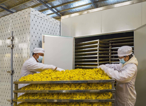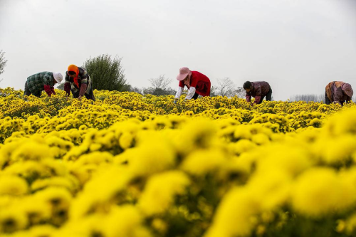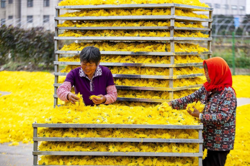 今年夏季,當地農民在收獲油菜后種植了450畝的婺源皇菊和金絲皇菊。村民們穿梭在“花海”之中,趁著晴好天氣采摘成熟的花朵,再進行烘烤、銷售,田間地頭一派繁忙的豐收景象。 |