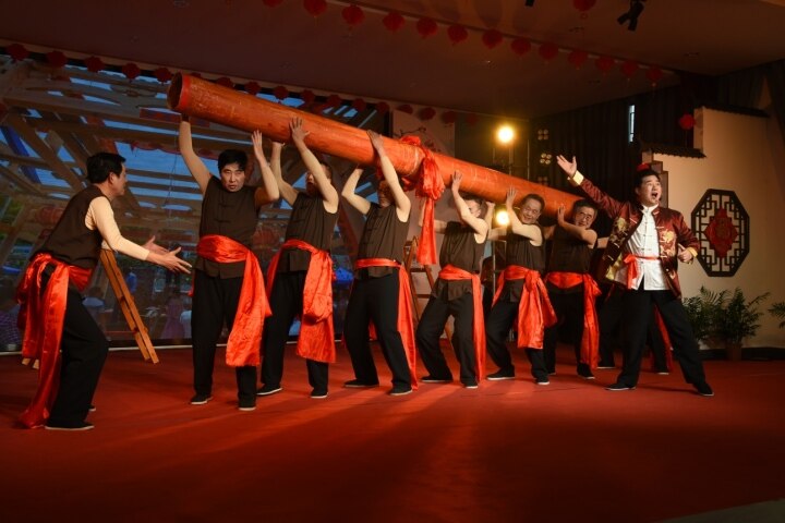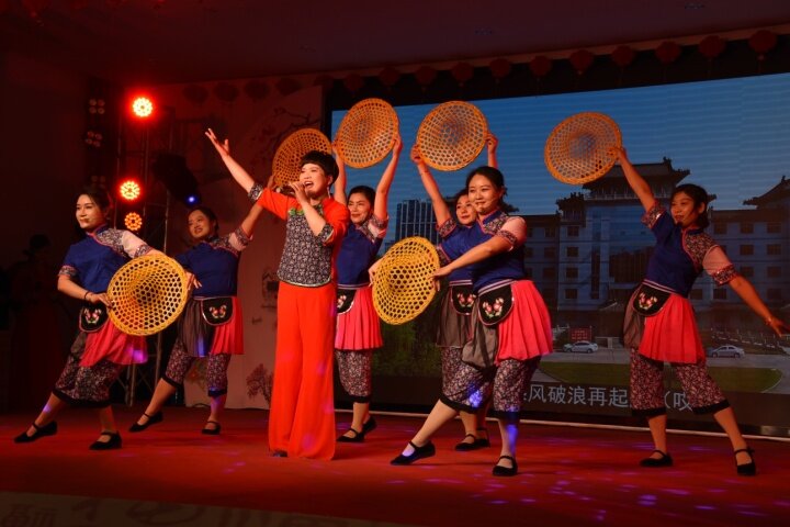 《沙溝板凳龍舞》《興化有戲》《挑擔號子》《起大梁》《古鎮記憶》《來往沙溝》等節目輪番上演,臺下觀眾掌聲不斷。作為開場舞,《沙溝板凳龍舞》一登場就吸引了觀眾的目光。演員們手拿木頭做的四腳板凳當道具代替龍身,龍頭領先,龍身龍尾緊相隨,舞得像真龍一樣彎曲盤旋翻騰,氣勢磅礴,蔚為壯觀。“沙溝板凳龍舞”從東岳廟會的祭祀表演活動,演變成群眾喜聞樂見的民間舞蹈,具有濃厚的地域文化色彩和獨特的水鄉風情,2009年6月被列入江蘇省級非物質文化遺產保護名錄。《沙溝板凳龍舞》演員之一江紅霞說:“作為興化市沙溝鎮藝術團成員,能在‘鄉村村晚’展示非遺板凳龍舞,我和隊員們非常開心!這個舞很喜慶,希望帶給大家愉悅的心情。”此外,該團隊還帶來了沙溝鎮鎮歌《來往沙溝》,用歌伴舞的表演形式,體現沙溝鎮的人文風貌。 “興化是個美麗的水鄉,興化是個富饒的地方,春天里千垛菜花黃……”垛田是興化特有的農業文化遺產,已有約600年的歷史,狀如小島,物產豐饒,景色旖旎。興化市僑之緣文化藝術團帶來了《垛上花》舞蹈,通過歌舞肢體動作展現興化垛田的美景。該藝術團團長易碧霞說,《垛上花》由她編舞,黃色的扇子如同黃色菜花,演員們揮舞扇子的動作充分展示垛田菜花盛開的模樣。“為了這場演出,我們連續排練了半個月,希望廣大觀眾通過舞蹈了解興化,多多來興化做客。”值得一提的是,搭配該舞蹈的背景音樂《興化小調》是興化籍作曲家許曉明特地為家鄉創作。