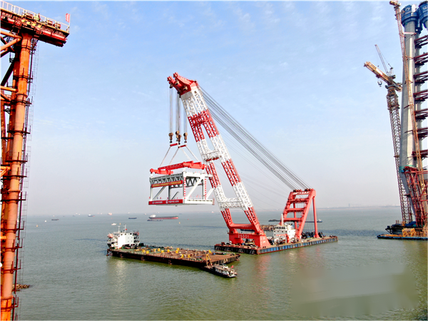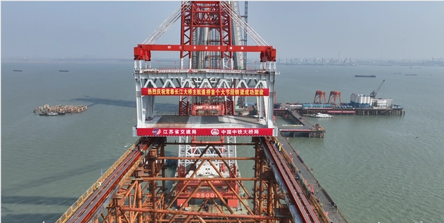 常泰長(zhǎng)江大橋是在建最大跨徑公鐵兩用斜拉橋,大橋集三種過(guò)江方式于一體,上層為六車道高速公路,下層分別設(shè)置為雙向城際鐵路和四車道普通公路。大橋于2019年1月9日開(kāi)工,工期預(yù)計(jì)為5年半。建成后,泰州人到常州至少可節(jié)省半小時(shí)車程。大橋主航道橋采用雙主桁“N”形鋼桁梁,桁高15.5米,桁中心間距35米。全橋共有91個(gè)大節(jié)段,每個(gè)節(jié)段長(zhǎng)14米-28米,重約900噸—1856噸。整節(jié)段鋼桁梁在工廠制造完成后通過(guò)水路運(yùn)至橋位處整體吊裝架設(shè)。 據(jù)了解,首次吊裝的大節(jié)段鋼桁梁位于常州側(cè)邊跨。1月30日,從數(shù)十公里外的如皋江邊,將長(zhǎng)22米、重1280噸的首段鋼梁裝船完畢,這座相當(dāng)于850部小轎車重的鐵家伙逆江而上,經(jīng)過(guò)半天的水路運(yùn)輸?shù)竭_(dá)常泰長(zhǎng)江大橋施工現(xiàn)場(chǎng)。 將動(dòng)輒上千噸的鋼梁節(jié)段吊裝于高聳的支架上,這相當(dāng)于在空中吊起約160頭成年非洲象。而且兩桁拖拉同步誤差要控制在5毫米以內(nèi),這對(duì)施工精度控制提出了很高要求。同時(shí),主航道橋常州側(cè)邊跨和輔助跨要跨越陸地、江灘、深水三種環(huán)境,河床覆蓋層為硬塑粉質(zhì)黏土,施工的水域狹小,流速大,潮差可達(dá)1.5米左右,這使得作業(yè)船只面臨走錨風(fēng)險(xiǎn)。