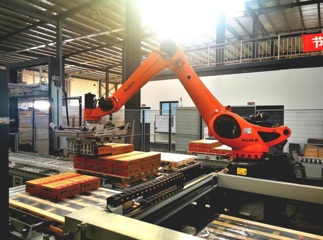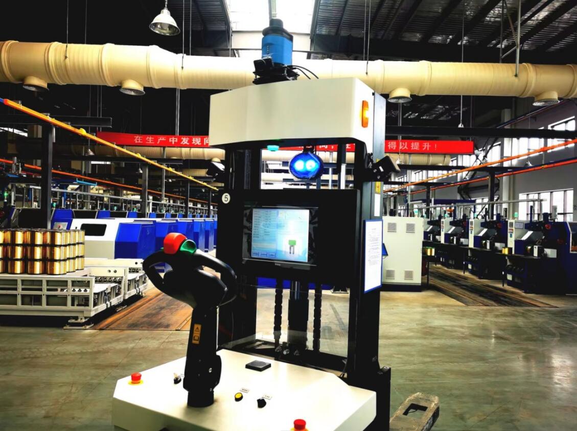 廠長李玉峰介紹,所謂“鏟車”是AGV機器人,它的功能是自動化運輸;所謂“手臂”是六軸機器人,它的功能是上卸工字輪,800多公斤的“大家伙”,輕輕地一抓就起來。