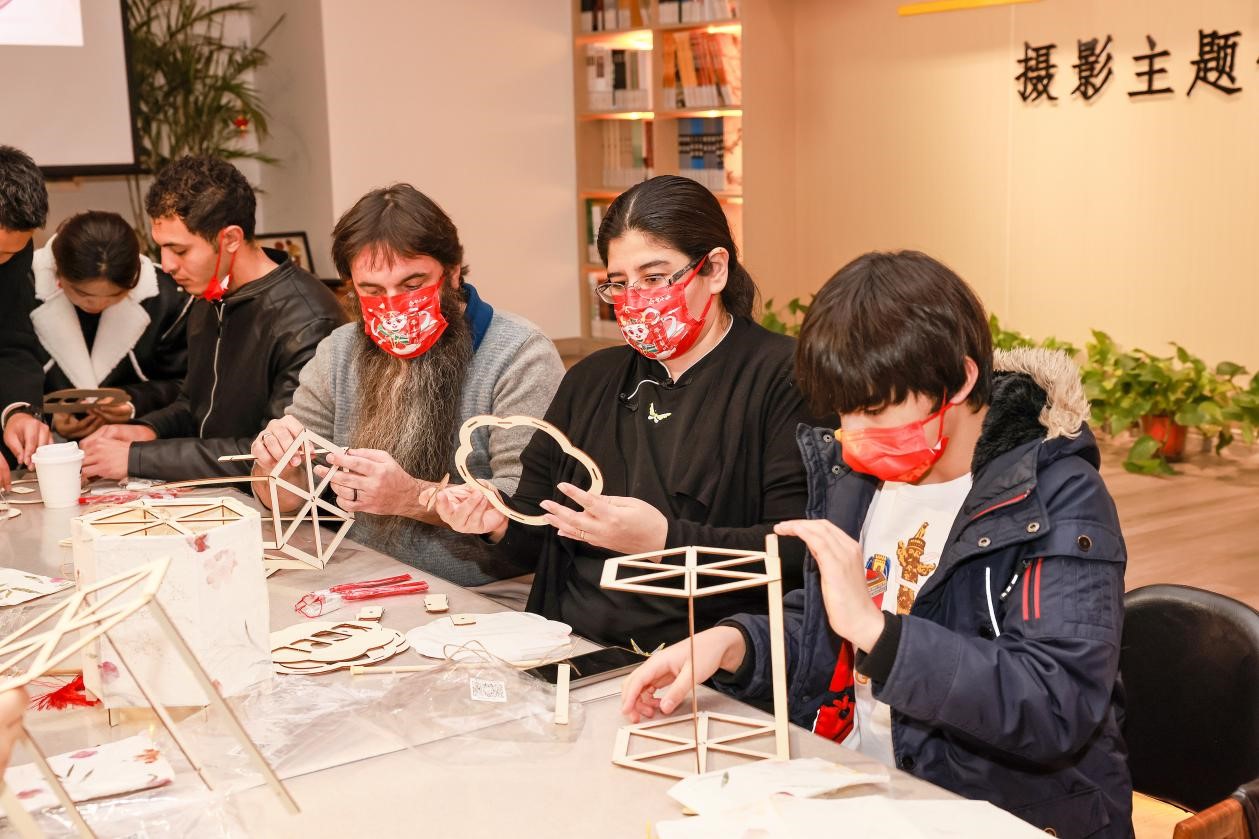 燈謎是中國古老的文字游戲,蘊藏著獨特的機巧和智慧。牧城書驛外的廊亭掛滿綴著燈謎的花燈,外國友人穿梭其間解字猜謎。來自牙買加的Shanice很快猜出兩道謎題,開心地向同伴分享喜悅。外籍友人還共同制作手工花燈,盞盞花燈、熒熒燈火,映照出對新一年的美好期許,將節日氛圍拉滿。