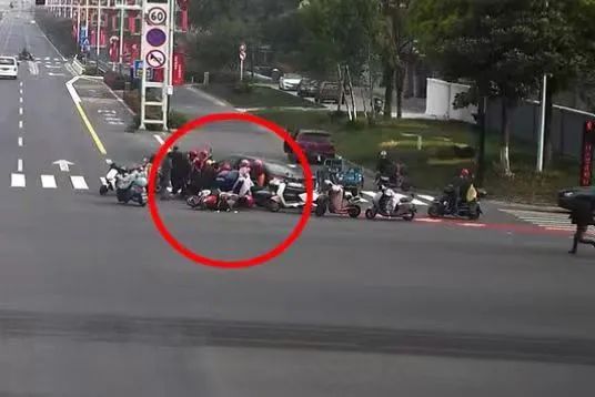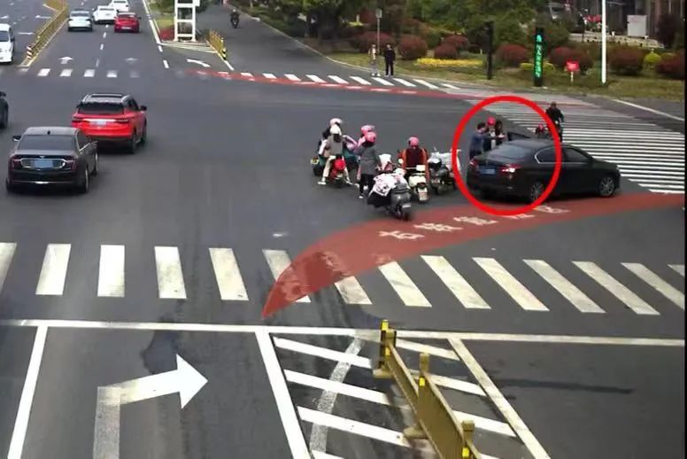 4月14日上午8時15分許,一輛小轎車在溱湖大道和姜堰大道十字路口右拐時,將一輛電動自行車撞倒,電動車上的大人和小孩摔倒在地。