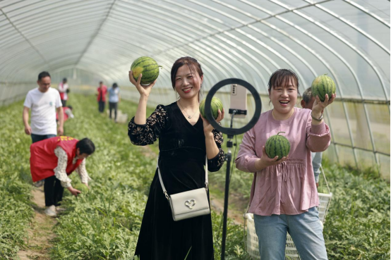 挑選、采摘、搬運、裝車⋯⋯走進西瓜大棚,綠油油的西瓜藤鋪滿大地,一個個圓滾滾的西瓜掩映其中,用手輕輕一敲就能聽見清脆的“咚咚”聲,大家忙著采摘,一派忙碌景象。婁東村黨總支書記、村委會主任祝竹手機響個不停,都是要貨的電話。祝竹說,當天采摘的特小鳳西瓜,黃瓤多汁、甜脆鮮嫩、皮薄形美,頭茬瓜上市時間早,從5月中旬持續賣到9月上旬,每畝產量約四千公斤,除去人工、租金等成本,每畝純收益可達1.5萬元以上,僅此一項增加村集體收入10多萬,還帶動10多位低收入農戶家門口就業。 “愛瓜的親們,這種迷你型特小鳳西瓜,每只三四斤,吃起來方便。” 在大棚采摘現場,該村的網紅主播孫琴、洪霞手捧著西瓜在線上直播。孫琴輕輕叩開一只瓜,露出新鮮的黃瓤,咬上一口,汁水四溢,香甜可口。姜堰城區網友張芳看到畫面,駕車直奔田頭,買了4只瓜。“雖然5元錢一斤,但吃口超過了大瓜,我每年都來買。”張芳坦言。
