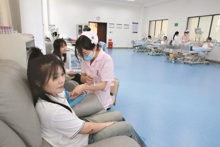 “學習藥物制劑,不僅要練就過硬本領,還要有奉獻精神。”在泰州市中心血站,正在獻血的泰州職業技術學院藥學院21藥劑班學生束鑫偉說。 6月26日,是21藥劑班學生離校實習的日子。上午11點,9名同學趕到泰州市中心血站捐獻全血和血小板,上離校前的“最后一課”。 中午時分,寬敞明亮的獻血服務大廳里,滿滿的青春氣息。針頭輕輕扎進血管,殷紅的鮮血緩緩流出,不一會就裝滿整個儲血袋。血液從胳膊中流出,經過機器分離,一部分流進儲血袋,一部分又流回體內。一張張年輕的臉上,洋溢著快樂的微笑,每個人的胸前,“丹心閃‘藥’,同舟共‘劑’”的徽章熠熠生輝。9名同學以這種特殊的方式慶祝完成學業,并用這份愛心匯聚青春正能量,踏上新的人生征程。 一周前,陳玉就和同學們相約:在離校前,去獻一次血,給自己的大學生活留下終生難忘的美好回憶。得知消息后,同學們紛紛報名,有些同學因為臨時感冒、發燒等原因不符合獻血條件,不得不放棄。 “每年陳老師都會帶著學生來獻血,但這一次,還是很不一樣。”泰州市中心血站獻血服務科科長周軼凡說。為做好服務,市中心血站安排專車接送,還為同學們準備了面包、牛奶和午餐。同學們最后相約:以后回泰州, 來一次就要獻一次血。 “作為一名藥劑人,將來要從事各種藥品的研發和生產,但血液是唯一不可人工制造又不可替代的特殊藥品,要守護好百姓健康,就必須捧著一片丹心,隨時奉獻自己。”帶隊老師陳玉說,自己堅持無償獻血24年,已累計獻血3.2萬毫升,獲得全國無償獻血獎金獎。“把學生們離開校園前的‘最后一課’開在獻血現場,就是要把這個特別的日子和特殊的景象印在學生腦海中,讓他們時刻牢記勤學苦練、無私奉獻,用心用情護佑人民群眾生命健康。”