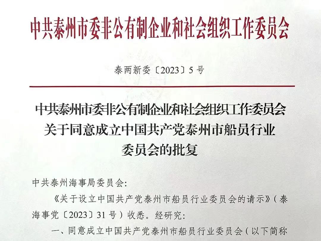 近日,經泰州市委“兩新”工委批準,中國共產黨泰州市船員行業委員會正式成立,這是全國首個“設區市船員行業黨委”。 為全力推進市船員行業黨委成立,泰州海事部門積極爭取地方支持,向泰州市委專題報告,多次拜訪泰州市委組織部溝通匯報船員行業黨建工作,最終在市委組織部指導下,在市交通運輸局的支持下,覆蓋泰州全市的船員行業黨委獲得批復成立。泰州市船員行業黨委接受市委“兩新”工委領導,由泰州海事局黨委負責日常管理,市交通運輸局黨組配合,將有效凝聚“海事+交通”的行業黨建合力。