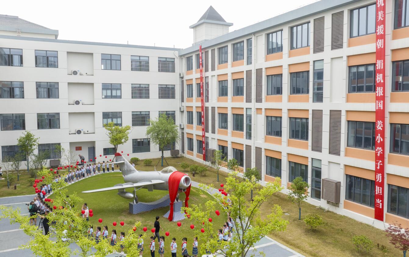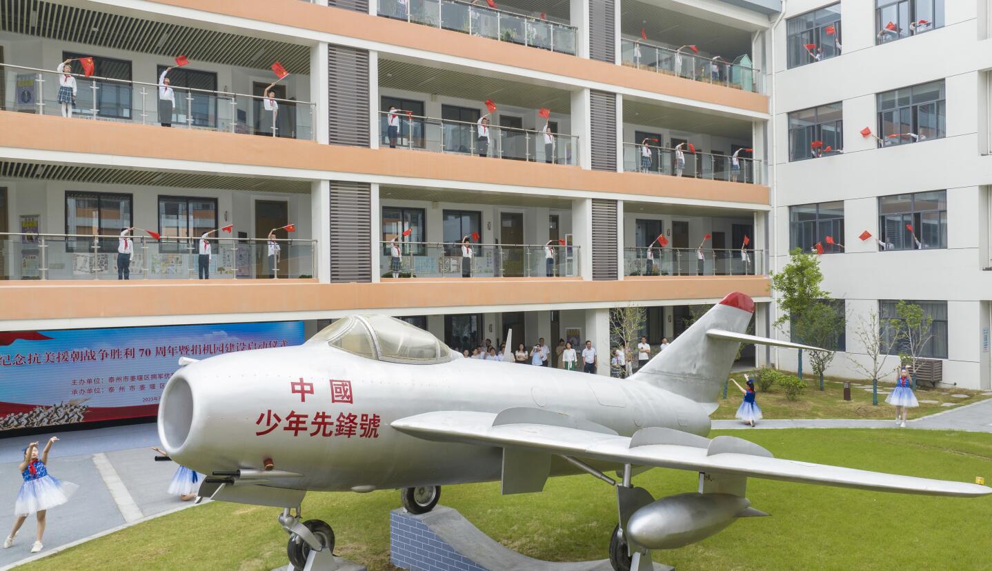 當天,該校舉行紀念抗美援朝戰爭勝利70周年暨捐機園建設啟動儀式。伴隨著洪亮的聲音,一架標注著“中國兒童號”字樣的飛機模型揭彩亮相,與該校南校區的另一架飛機模型遙相呼應,成為學校開展愛國主義教育的又一生動教材。