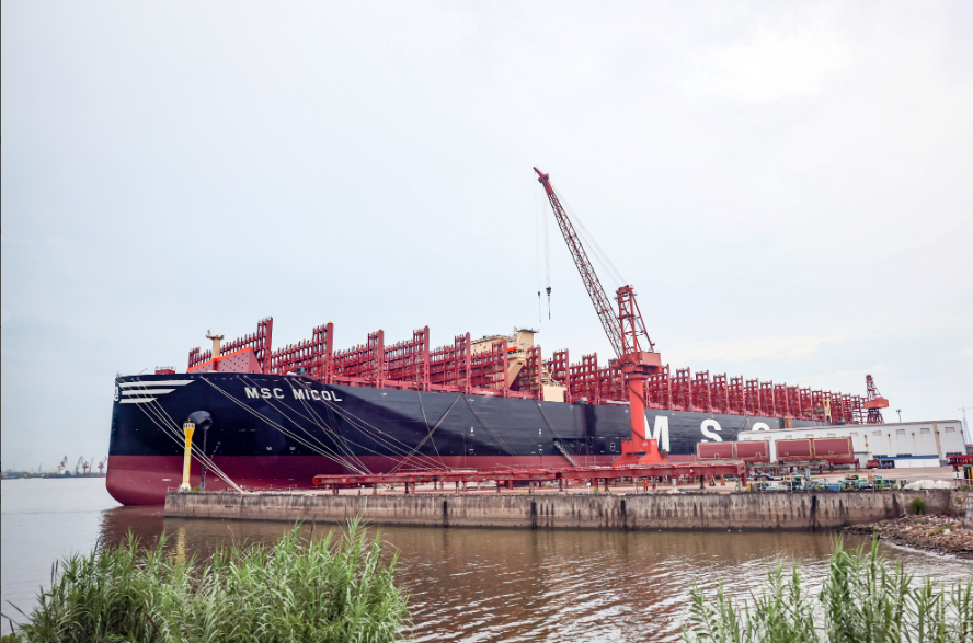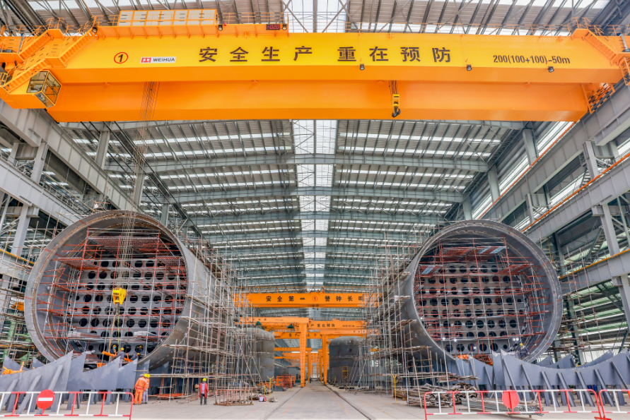 △新時代造船LNG罐體生產現場 朝著“高端化、智能化、綠色化”方向加快轉型,已成為靖江船企的共識。近年來,靖江船企推進產品結構逐步向高技術、高附加值延伸,“兩高”船舶建造能力不斷加強。 去年10月,揚子江船業與歐洲船東簽訂兩艘17.5萬立方米LNG運輸船建造合同,成功挺進代表造船工業最高水平、享有造船業“皇冠上的明珠”之稱的LNG船建造領域。今年,企業又接連交付3艘全球最大24000TEU集裝箱新船,在超大型集裝箱船建造領域的市場地位和品牌效應進一步鞏固。 向“智改數轉”要效率 7月28日,江蘇新揚子造船有限公司為SEASPAN公司建造的第四艘15000TEU集裝箱船順利命名交船,首航青島港。該船創造了姐妹船建造中的最短塢期85天和最短水下周期55天新紀錄。