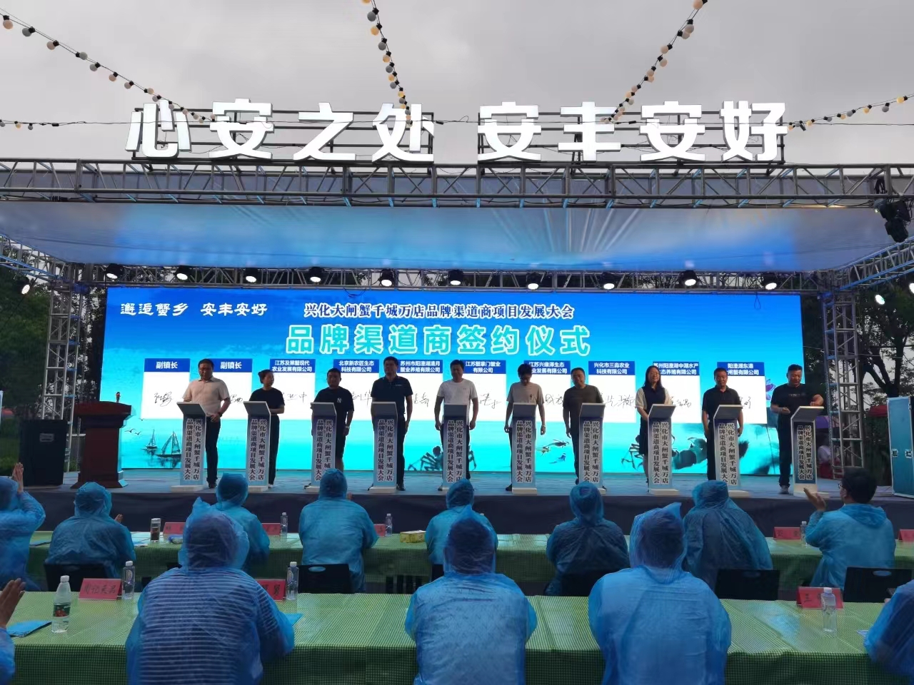 安豐鎮(zhèn)到底有多少蟹塘面積?今年初,安豐鎮(zhèn)組成4個小分隊,分赴42個行政村,全面核實每個蟹塘確權(quán)面積、秧池、自留地、場基等構(gòu)成,同時租用第三方無人飛機,對全鎮(zhèn)所有蟹塘面積進行航拍,統(tǒng)計每個蟹塘的實際面積。經(jīng)統(tǒng)計,全鎮(zhèn)現(xiàn)有河蟹養(yǎng)殖塘口7844個、17.86萬畝,除去村民的場基、秧池、自留地等,剩溢面積近1萬畝。 “村集體的嚴(yán)格收回來、閑散的認(rèn)真盤起來、老百姓的努力合起來”,一場維護村集體和老百姓利益的攻堅戰(zhàn)隨即打響。截至5月底,安豐鎮(zhèn)新增村集體經(jīng)營性收入1120萬元,同比增加51%,村平均增加26.7萬元。而通過蟹塘資源的規(guī)范管理,該鎮(zhèn)理順了塘口的所有權(quán)、承包權(quán)、經(jīng)營權(quán),穩(wěn)定了塘口承包關(guān)系,化解了大量涉農(nóng)涉地的信訪矛盾,有效維護了村集體、老百姓的合法權(quán)益。 尋找“最會賣蟹的人” 7月20日,在安豐新時代·銀座文旅街區(qū),興化大閘蟹千城萬店品牌渠道商項目發(fā)展大會舉行。現(xiàn)場,來自全國各地的24家品牌渠道商與安豐鎮(zhèn)簽約,共同做強安豐螃蟹“買全國、賣全國”品牌。