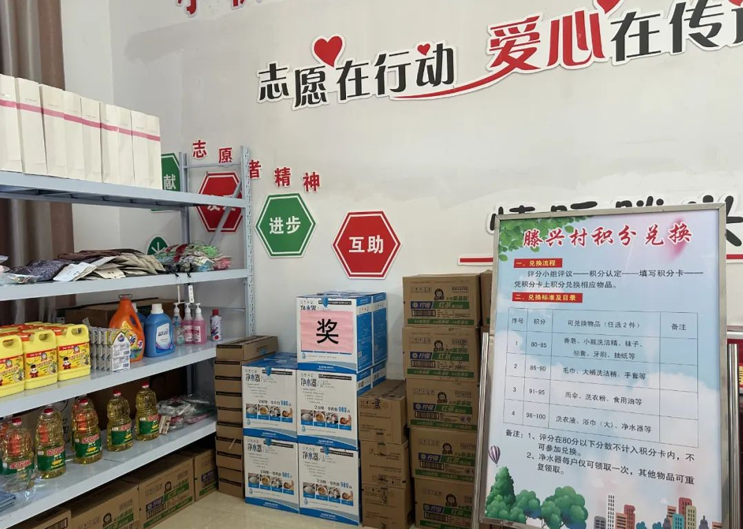 “積分超市”設在滕興村新時代文明實踐站內。2022年,該村整合黨建經費、社會捐贈、幫扶資金等,建立鄉風文明基金,推行“一約一分一榜”文明實踐積分管理制度,運用“小積分”撬動鄉村“大文明”。