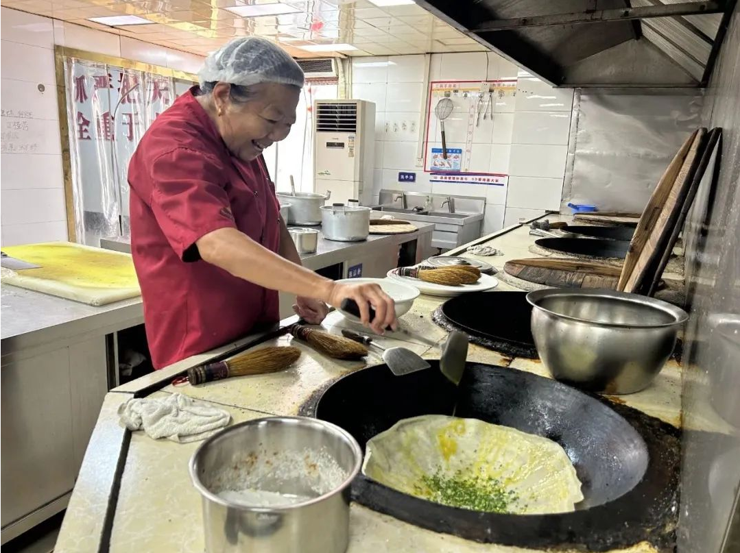 “這是我今天做的第132個餅了!”泰興市黃橋鎮祁巷村村民余蘭珍將食用油倒下鍋,油熱后,將和好的面糊倒入鍋里,用鏟子反復攤平翻面,再撒上一層白糖,一張薄薄的燒餅便出鍋了。