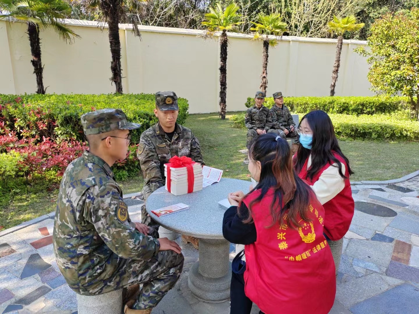 “我們中隊(duì)一戰(zhàn)士的老家發(fā)生鄰里矛盾,在你們巾幗暖陽(yáng)法律服務(wù)隊(duì)和泰興市法律援助中心的幫助下順利解決了,非常感謝法律援助工作,希望你們?cè)谥嘘?duì)設(shè)立法律援助點(diǎn),能經(jīng)常為我們官兵講法、援法。”武警泰州支隊(duì)泰興中隊(duì)中隊(duì)長(zhǎng)劉天國(guó)說(shuō)。武警駐泰部隊(duì)不僅擔(dān)負(fù)日常看守任務(wù),同時(shí)也是保一方平安和穩(wěn)定的突出力量,泰興市有關(guān)部門(mén)在武警泰州支隊(duì)泰興中隊(duì)設(shè)立“法律服務(wù)聯(lián)系點(diǎn)”,支部黨建品牌“巾幗暖陽(yáng)”法律服務(wù)隊(duì)深入班排,與官兵們面對(duì)面座談,對(duì)涉法問(wèn)題“一對(duì)一”解答,打通法律擁軍“最后一公里”,確保官兵有涉法問(wèn)題,能夠在第一時(shí)間得到援助,確保他們?cè)诓筷?duì)內(nèi)無(wú)后顧之憂。