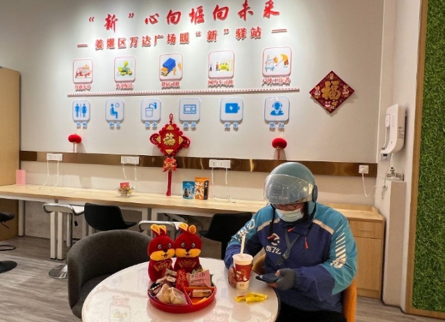 近日,泰州市姜堰區羅塘街道萬達廣場暖“新”驛站迎來一群外賣員,有的給手機充電,有的打水休息,有的盯著手機上的訂單信息,都在等候接單高峰。這個不大的房間成了他們在鬧市中的最佳“立身之所”。 隨著新業態經濟的快速發展,外賣員、快遞員等新業態新就業群體已逐漸成為推動城市發展、服務社區治理的重要力量。泰州市姜堰區聚焦解決新業態新就業(“兩新”)群體急難愁盼,在社區黨群服務中心、臨街商圈等多處設置暖“新”驛站,為新就業群體提供綜合性共享空間和便利服務,凝聚“新”力量,激發“新”活力。
