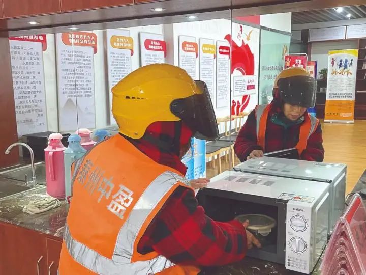 泰州市總工會一樓有個工會戶外勞動者愛心服務站,當天同樣迎來不少戶外勞動者。泰州中盈環境管理有限公司保潔員周樹芹,當天負責鼓樓南路部分道路保潔。中午12點多,她拿著提前備好的午飯到驛站用微波爐加熱,“戶外勞動者愛心服務站設施齊全,只要值班時間長,我的早飯和午飯都可以帶過來加熱了吃,尤其這種下雪天,可以歇腳、取暖、接熱水,真的很暖心!”吃完午飯,手機電量也已充滿,短暫休息后的周樹芹重回崗位上。