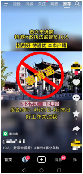 4月22日,泰興某抖音賬號惡意曲解政府機關選聘公告,稱泰興市即將選聘的“特邀行政執法監督員福利好、待遇優”。