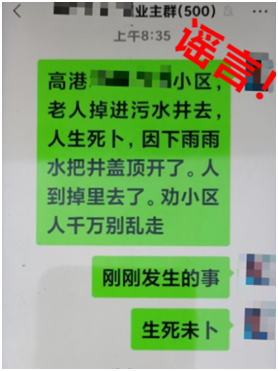 7月7日,醫藥高新區(高港區)出現暴雨,某網民在小區微信業主群發布“高港**小區老人掉進污水井去,生死未卜,因下雨雨水把井蓋頂開了”等不實言論,引發社會恐慌。