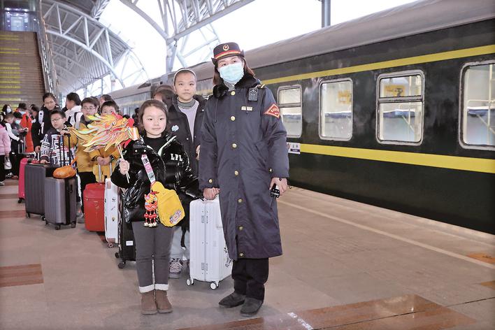 據了解,此次研學團成員以江蘇省第二十屆運動會的吉祥物“泰寶”命名為小“泰寶”。“泰寶”象征著泰州的珍寶——麋鹿,既有親切感,也容易記憶,同時體現了泰州的地緣特色和文化底蘊。 “這61名小‘泰寶’不僅僅是去哈爾濱開展游學活動,也是宣傳泰州、推廣泰州的小代表。”泰州市文廣旅局旅游推廣處負責人說。 為了保障小“泰寶”們安全順利登車,泰州火車站開辟了綠色通道,為小“泰寶”們設置了專門候車區。在等車期間,工作人員還向孩子們贈送了龍年元素的福袋和掛件。“小朋友們跟著我走,到了站臺要注意安全。”開車前半小時,客運值班員齊萍、徐幼萍一路護送,直到小“泰寶”們走進車廂才放心地和孩子們揮手告別。 當天晚上,孩子們首先乘坐T3217泰州至北京列車,然后再轉乘前往哈爾濱,正式開啟為期六天的研學之旅。同時還有8名工作人員陪同,與其他帶隊老師、生活老師一起北上哈爾濱。 1月29日上午7點,不少孩子已經興奮地起床。上午8點,小“泰寶”還有個神秘工作需要完成。