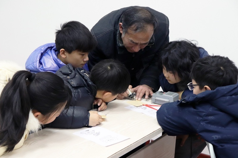 本次活動邀請泰州市海陵烙畫技藝傳承人張文亭現場授課。張文亭向孩子們分享了他的烙畫作品。結合龍年主題,張文亭還精心創作了《幸福泰州 龍騰鳳城》木板畫,在銀杏木上勾畫烘燙出“一龍一鳳”,四周祥云繚繞,工藝精湛、細膩生動,承載著幸福、騰飛的美好寓意。 在實踐環節,張文亭還精心準備了“龍年主題”的烙畫素材,孩子們迫不及待地拿起“畫筆”嘗試起來。“意在筆先,落筆成行。同時,要注意溫度、力度和速度。”張文亭邊提醒邊逐一指導。