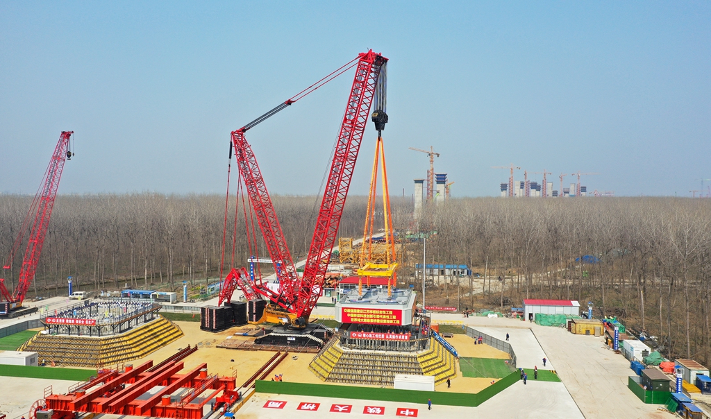 大橋南航道橋北主塔位于靖江市馬洲島。高350米的北主塔為門字形結構,是世界最高懸索橋索塔,采用世界首創鋼箱—鋼管約束混凝土組合索塔設計,分上下游兩幅塔柱施工,每個塔柱30個節段,將像搭積木式的層層向上疊加安裝。本次吊裝的北主塔T1鋼塔首節段,長18.2米、寬13.7米、高3.6米,重量約720噸,為關鍵控制性節段,也是難度最大、精度要求最高的安裝節段。