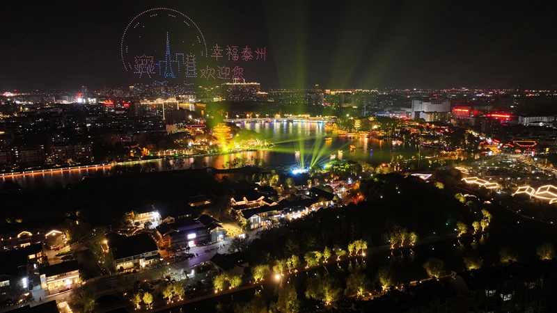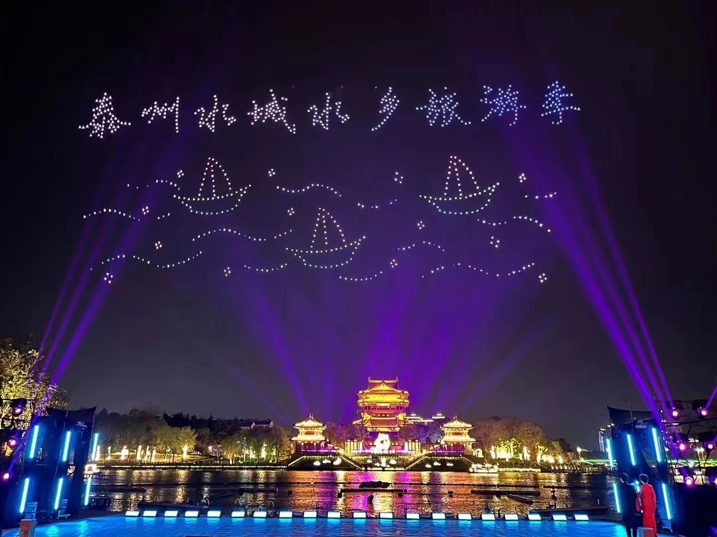 當晚,800架無人機以天為幕、以城為景,在聲光電的絢爛襯托下閃耀登場。以天為幕,以城為景。“江淮第一樓”望海樓在夜色中被旋轉點亮。“她”初建于南宋,多少人曾經登上它眺望海天一色,如今大海褪去,但望海之情猶在,依舊在泰州人的心中流光溢彩。