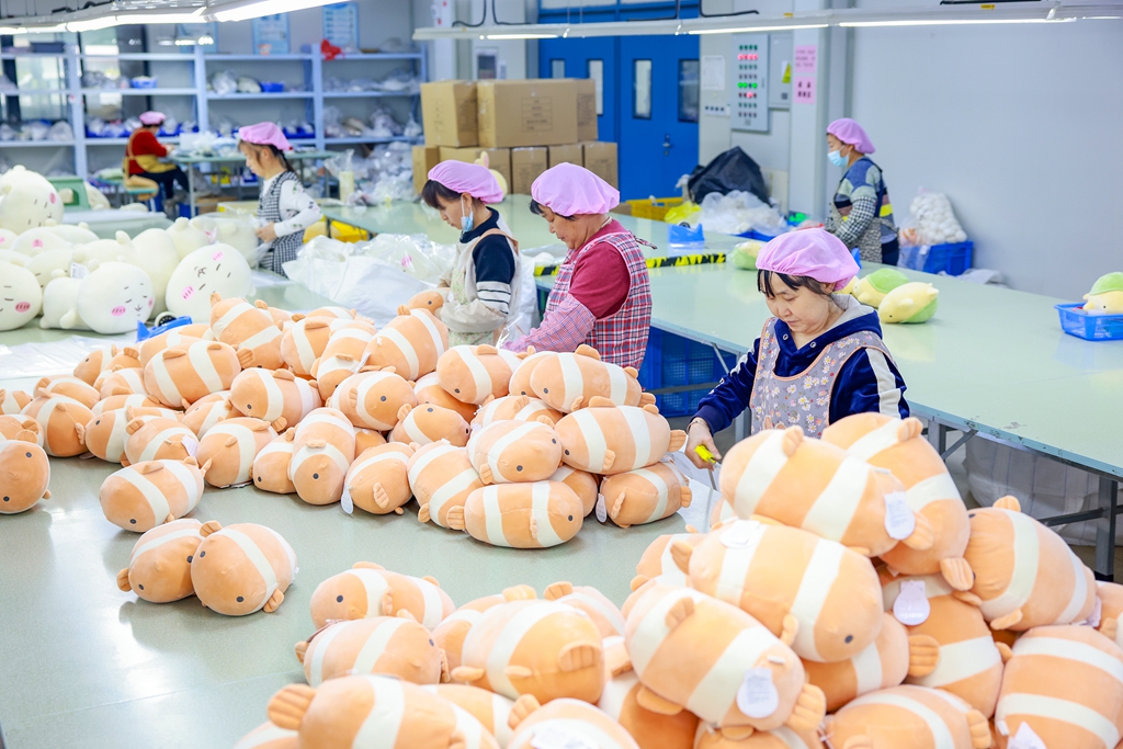麗芙之心玩具主要生產毛絨玩具等家居類用品。“我們的產品大量銷往日本、歐美等國家和地區,海外訂單源源不斷。”公司總經理李靚說,制作毛絨玩具有10多道工序,對安全性、舒適性的要求很高,過硬的品質是麗芙之心玩具受到國外市場認可的關鍵因素。 茶犬公仔、奶酪貓、寶石龍……麗芙之心玩具公司有一間產品陳列室,里面有1000多個樣品,各個設計精妙、做工逼真。這僅僅是該公司多元化產品的冰山一角,據統計,該公司已研發生產了近萬款不同類別的毛絨玩具,年產毛絨玩具100余萬件。 這兩年,公司還積極開拓國內市場,通過淘寶、抖音、小紅書等線上平臺進行銷售。每天一上班,倉庫工作人員就會對線上訂單進行一一清點、核對、登記,以最快的速度發貨。“最近訂單比較穩定,基本每天發出六七百件。”打包工孫貴珍說,遇上爆倉的時候,一天需要發貨四五千件,大家雖然忙得腳不沾地,但是成就感滿滿。