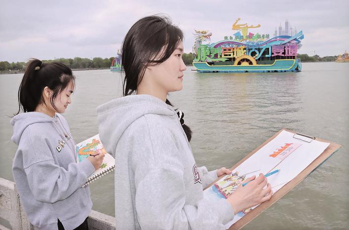 南京理工大學泰州科技學院4名大學生相約來溱湖寫生,恰遇貢船巡游,他們情不自禁拿起畫筆專心創(chuàng)作。大學生王雪純畫的“活力姜堰”貢船,再現(xiàn)溱湖“千舟齊發(fā),萬篙激浪”勝景,畫作還穿插了麋鹿靈動奔跑的身影,彰顯蓬勃生機活力。王雪純來自無錫,現(xiàn)在讀大三,學的數(shù)字媒體藝術(shù)專業(yè),此前曾來過溱湖,感受了原生態(tài)濕地美景,但這是第一次近距離看到美輪美奐的貢船。“我將發(fā)揮專業(yè)特長,畫出精彩壯觀的會船盛景,吸引更多游客來溱湖打卡。”王雪純說。 9歲的俞清淼第一次看到貢船特別興奮,不停地用電話手表拍下眼前的美麗畫面。 “今天我來溱湖玩,看到湖面上接二連三的貢船,上面有喜鵲、麋鹿、飛龍,還有鳳凰,感覺走進了多彩浪漫的童話世界。”俞清淼說,回家后,他要寫一篇日記,還要動員更多同學來溱湖看船賞景。 “都說‘溱潼會船’沒戶口,過了開幕式就會走。今年的貢船巡游和篙船比賽改變了這樣的慣例。”市民丁桂蘭說,會船延長時間,精彩不間斷,快樂不打烊,滿足了全民共享會船民俗的樂趣,也助推旅游熱不斷升溫。 溱湖文旅集團副總經(jīng)理顧宇鳴介紹,今年,姜堰區(qū)精心打造“龍興姜城”“龍行龘龘”“活力姜堰”等8條氣勢恢宏的主題貢船,通過民族化、藝術(shù)化、形象化的豐富造型,展現(xiàn)中華民族精神圖騰“龍”文化,充分彰顯姜堰經(jīng)濟建設、社會發(fā)展、文化旅游、生態(tài)文明等方面的嶄新風貌。會船季期間,每逢雙休日,溱湖景區(qū)都將組織貢船巡游和篙船比賽,活動持續(xù)至5月。 |