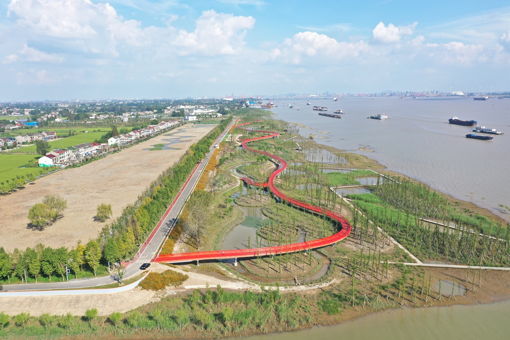 4月1日下午,一艘裝載著4.8萬噸煤炭的海輪靠泊深國際港口江蘇靖江港碼頭,成為該碼頭自去年12月開港運營以來,靠泊的第19艘海輪。深國際智慧物流中心項目致力于綠色化、智能化港口建設,全封閉干煤棚的運用開創了長江岸線港口物流企業的先河。 靖江將以深國際智慧物流港區為示范引領,推動傳統碼頭往數智化方向轉型,打造長三角一流的智慧港口、綠色港口。同時,主動對接上海港、寧波港、太倉港,打造大宗商品集散交易、江海聯運國際物流等樞紐中心,真正將大進大出的港口“流量”轉變成為我所用的經濟“增量”。 渡江戰役期間,駐扎在新橋鎮的三野23軍69師207團第一、第三先鋒突擊營1000余人,憑借靖江人民創造的“半帆待命”戰術,僅用16分鐘就渡過了長江,被譽為“渡江先鋒突擊團”。 “半帆待命”彰顯了靖江人敢為人先、破舊立新的勇氣。正是這種勇氣的傳承,新橋鎮漁憶濕地生態公園應運而生。原先,這里是雜亂不堪的碼頭、工廠和魚塘。2018年開始,靖江啟動退漁還濕工程,并對江灘實施生態修復。如今,這里已經成為靖江市民休閑觀光的好去處。