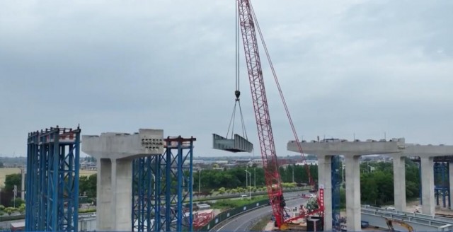 5月22日,江陰靖江長江隧道北接線項目鋼板組合梁架設作業中體量最大的鋼梁開始吊裝,靖江互通鋼板組合梁架設工作預計6月底完成,整個北接線項目建設已完成工作量的60%。 記者在作業現場看到,工人操作機械將一根重量超過90噸的鋼板梁成功吊起、安裝。本次作業為靖江互通匝道首跨吊裝施工,安裝部位為北接線主線高架橋第五聯上跨靖江互通,全長204米,互通匝道四跨梁體總重達1955噸。 江陰靖江長江隧道北接線項目部總工程師宋浩介紹:“此孔靖江互通鋼板組合梁跨徑50米,單片重量90.1噸,一共是橫向4片梁。吊裝過程中,我們是以從右幅到左幅的方向依次進行持續架設的。” 根據施工計劃,項目部將利用一個月時間完成靖江互通高架橋整體施工,涉及兩個地面匝道及一個高架匝道,均為城市主干道,車流量大,施工難度也大。 江陰靖江長江隧道北接線項目部總工程師宋浩說:“履帶吊的站位、旋轉半徑,以及它的起吊角度,都有嚴格的要求。為了盡量減少對市民通行的影響,我們將分時段依次對匝道口進行封閉。” 除了靖江互通作業點,江陰靖江長江隧道北接線項目還有另外7處也在同時開展鋼板梁架設工作,計劃今年年底完成所有架設工作。