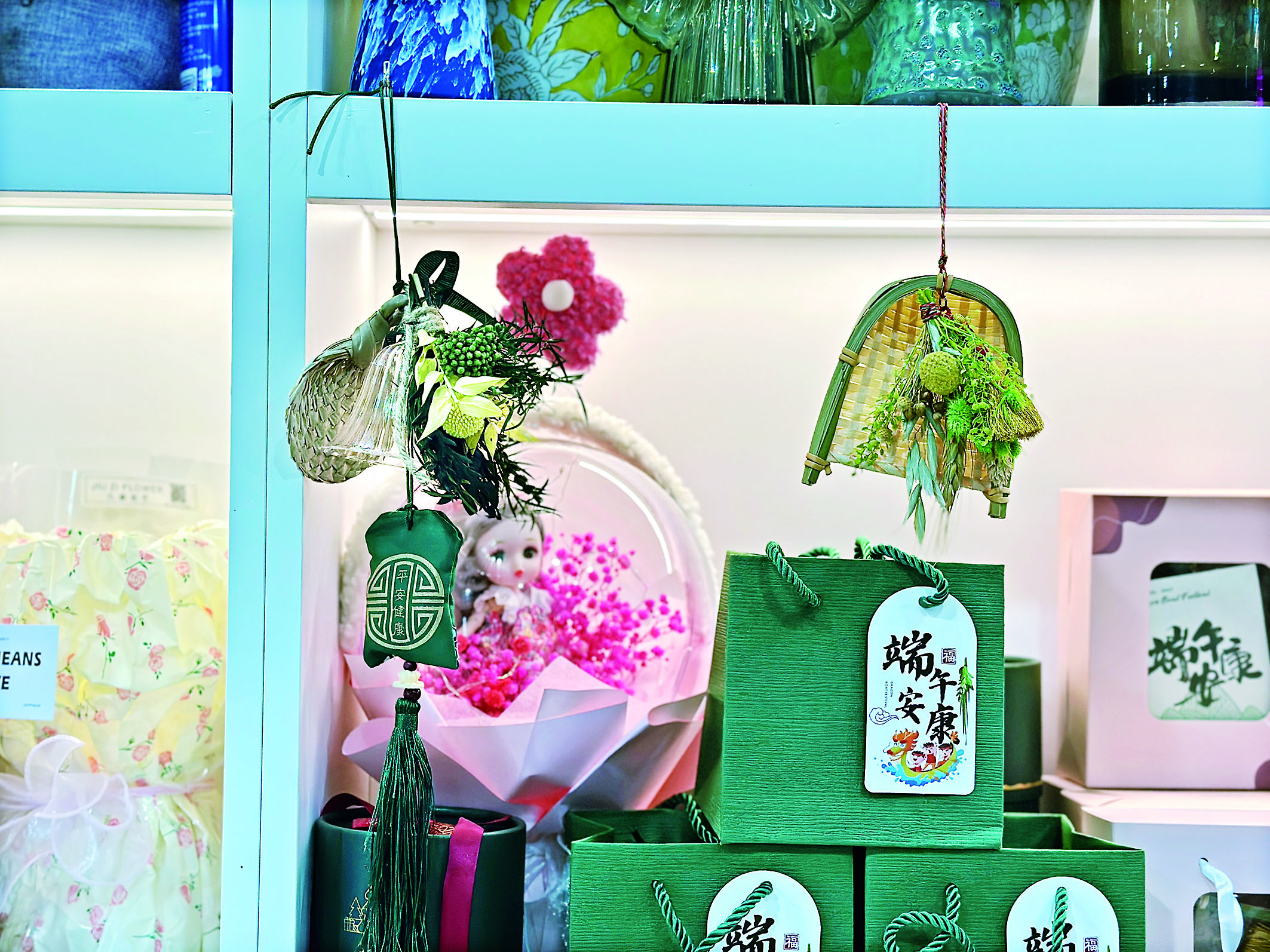 端午節掛艾草的習俗由來已久,寓意驅邪納福。6月5日早上,記者在泰州市海陵區城中街道暮春農貿市場門口看到,不少市民手持艾草走出市場。市場內,幾乎每個菜攤上都有艾草售賣,搭配菖蒲葉,三塊錢兩把。“這幾天是艾草銷售高峰期,每天開市前桶里插得滿滿的,不一會兒,四五十份就賣完了,9點鐘之后基本買不到。”攤主張女士說,來市場購買艾草的既有中老年人,也有不少年輕人。 不過,記者采訪中了解到,不少年輕人正用自己的方式和審美,賦予這個傳統節日新的儀式感。比如,不少花店抓住年輕人熱愛新鮮事物的特點,將幾塊錢一把的艾草,精心包裝變成火爆全網的艾草香囊、驅邪門掛、車載掛飾、菖蒲花束等。 “艾草驅蟲辟邪,菖蒲寓意家宅平安,玉簪葉象征和睦,小葫蘆諧音‘福祿’……”海陵區城北街道久姿花店店主王小勤說,她的一位老顧客在5分鐘前預訂了10束艾草花束。一把新鮮的艾草葉搭配菖蒲葉、玉簪葉、香樟果、綠毛球、黃金球等材料,包上果凍膜,再掛上賀卡、小葫蘆、香囊等飾品,大約20分鐘,一束精美的艾草花束就在王小勤熟練的動作中完成包裝。“今年來買艾草花束的顧客是往年的三倍以上,早在半個月前我就接到預訂單,大多數是年輕人買來送給朋友或長輩。”
