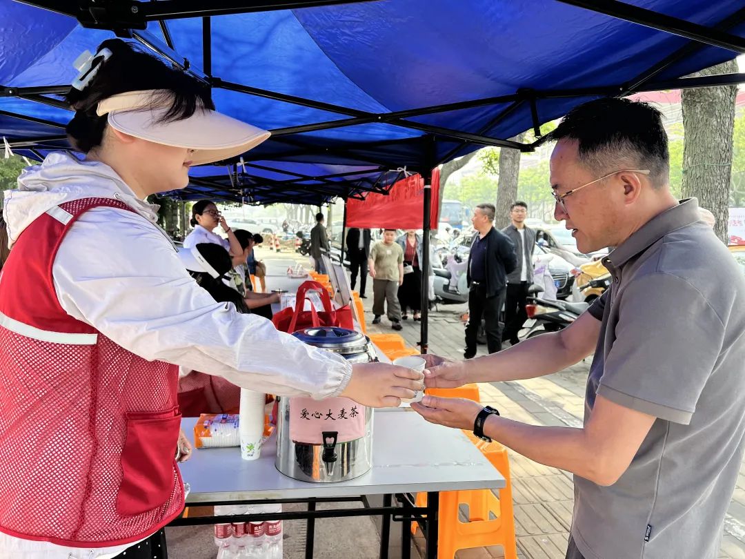 在江蘇省泰州中學(xué)(以下簡稱省泰中)考點門口,不少高三年級班主任早早就來到了校門口,他們身穿紅色服裝,為班上每個孩子分發(fā)準考證,并一一送上祝福,場面十分溫馨。來自泰州民興實驗中學(xué)的老師們跟車一起來到考點,一邊發(fā)準考證,一邊為孩子們加油打氣。 服務(wù) 愛心驛站細致入微 在口岸中學(xué)考點南門對面的馬路邊,是高考服務(wù)點,為考生和家長免費提供礦泉水、人丹、清涼油、藿香正氣水等防暑降溫物品。