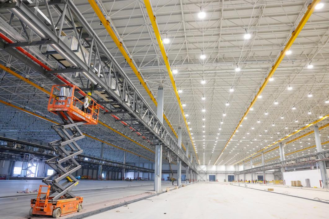 △圖為深國際靖江港碼頭高效作業(yè) 企業(yè)開創(chuàng)長江岸線港口物流企業(yè)先河,建設(shè)全封閉干煤棚封閉式料倉,配有封閉式皮帶廊道運輸系統(tǒng)以及裝卸船機、轉(zhuǎn)運站密閉罩、防塵簾等“二次防護(hù)”裝置,實現(xiàn)物料從卸貨、輸送、儲存、裝貨的水平輸送全流程、全封閉式管理。在封閉式料倉屋頂,配套了目前全省港口碼頭總?cè)萘孔畲蟆l(fā)電量最多的光伏電站,預(yù)計3個料倉可覆蓋8萬平方米的光伏發(fā)電系統(tǒng),年發(fā)電高達(dá)1300萬千瓦時,規(guī)模及發(fā)電量均處于全省港口領(lǐng)先水平。企業(yè)還全力推進(jìn)水環(huán)境污染防治,配備船舶生活污水接收裝置及一體化生活污水處理裝置,積極推進(jìn)“中水回用”,處理后的污水用于場內(nèi)抑塵和綠化澆灌,一系列舉措樹立起了港口標(biāo)桿示范。 綠色發(fā)展是高質(zhì)量發(fā)展的底色,越來越多的企業(yè)在“上新”項目時,注重從“含綠量”的提升中謀求“含金量”的提升。江蘇亞星錨鏈股份有限公司作為一家船用鏈條全國市場占有率達(dá)70%的重工企業(yè),持續(xù)挖掘節(jié)能潛力,推進(jìn)節(jié)能技術(shù)改造,從產(chǎn)品、工藝、設(shè)備、人員等方面推動節(jié)能降耗、降本增效工作,使能耗控制始終維持在行業(yè)較高水平。近年來,企業(yè)實行能源消耗定額管理制度,實施了調(diào)質(zhì)爐、鍛造加熱爐節(jié)能技改項目、節(jié)能型電機更換項目、分布式光伏項目等多項綠色低碳項目,年節(jié)能量近3000噸標(biāo)準(zhǔn)煤,企業(yè)的單位能耗穩(wěn)步下降,進(jìn)一步健全綠色制造體系,助力一條條船舶錨鏈走向世界,成長為高技術(shù)含量、產(chǎn)品高附加值的“世界錨鏈大王”。 新建綠色建筑群走“生態(tài)范兒” 走進(jìn)總投資52億元的凱飛民用航空結(jié)構(gòu)件生產(chǎn)制造項目建設(shè)現(xiàn)場,建筑工人們正在進(jìn)行室內(nèi)設(shè)施安裝,整個項目內(nèi)部裝修全部采用環(huán)保節(jié)能材料,使用的設(shè)施設(shè)備均是節(jié)能型,包括節(jié)能燈具、節(jié)能空調(diào)等,最終實現(xiàn)低碳減排的目的。