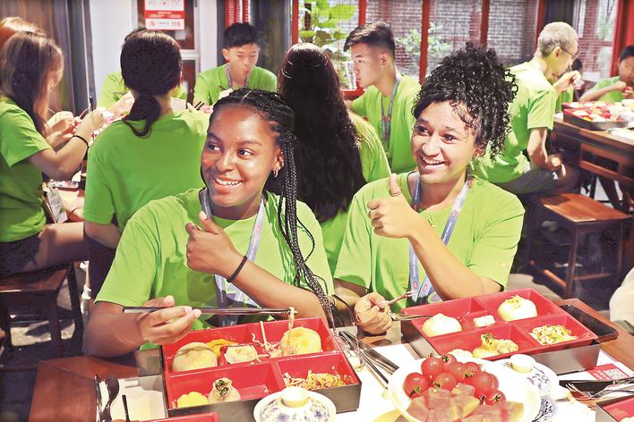 “還行,不難學!泵绹鴮W生Michael Zhang說,之前在家里吃過餃子,這卻是第一次自己動手包餃子。 包餃子要用筷子挑餡料,很多學生對筷子“無從下手”!拔疫是第一次拿筷子,不會用!泵绹鴮W生Mathews Lee'Anya有點靦腆。“沒事,我教你!笔√┲懈叨䦟W生楊欽園手把手教起她來,“這樣,用拇指、食指和中指輕輕拿住筷子,無名指墊在筷子下面,五指攏起來,把筷尖對齊,慢慢夾取食物! Mathews Lee'Anya反復嘗試,終于成功夾到餃子餡,開心得咯咯笑:“哇,好神奇!我學會了!” 來泰州自然不能錯過地道的泰州早茶。23日上午,美國師生來到泰州老街桃園里餐廳,品嘗傳統泰州早茶。 當熱氣騰騰的“一茶三點一面”依次端上八仙桌,美國師生一個個“哇”地張大嘴巴,紛紛掏出手機拍攝!斑@是‘泰州三寶’,燙干絲、魚湯面、蟹黃肉包。這是馬蘭頭燒賣、秧草包、蝦仁蒸餃,又稱‘日月星辰’組合。”面對香氣誘人的美食,聽著泰州早茶集團運營部部長黃美云的介紹,美國師生立馬開動,邊吃邊不住豎起大拇指點贊“Good!”