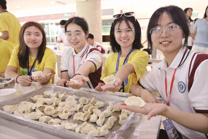 當天下午,省泰中老師董佳琪還帶領中美師生一起練習八段錦!霸诿绹灿泻芏嘀袊湫g組織,以華人為主,大家經常聚在一起練習,一些當地的美國人也會參與進來,體驗中國武術的魅力!泵绹鴰ш犂蠋烰ianqing Zhang說。 中醫作為我國傳統文化的瑰寶,博大而精深。23日下午,美國師生相繼來到揚子江龍鳳堂藥業集團、江蘇中藥科技園,感受中醫中藥的獨特魅力。在江蘇中藥科技園,美國師生還觀賞了清雅的茶藝展示,一同品鑒香茗。 包餃子品早茶,嘗地道“泰州味” 在我國,餃子是吉祥團圓的象征,每逢新春佳節,家家戶戶都要吃餃子。為使美國師生“入鄉隨俗”,22日中午,省泰中食堂的師傅們特地準備了餃子皮和餡料,帶領中美師生一起包餃子。