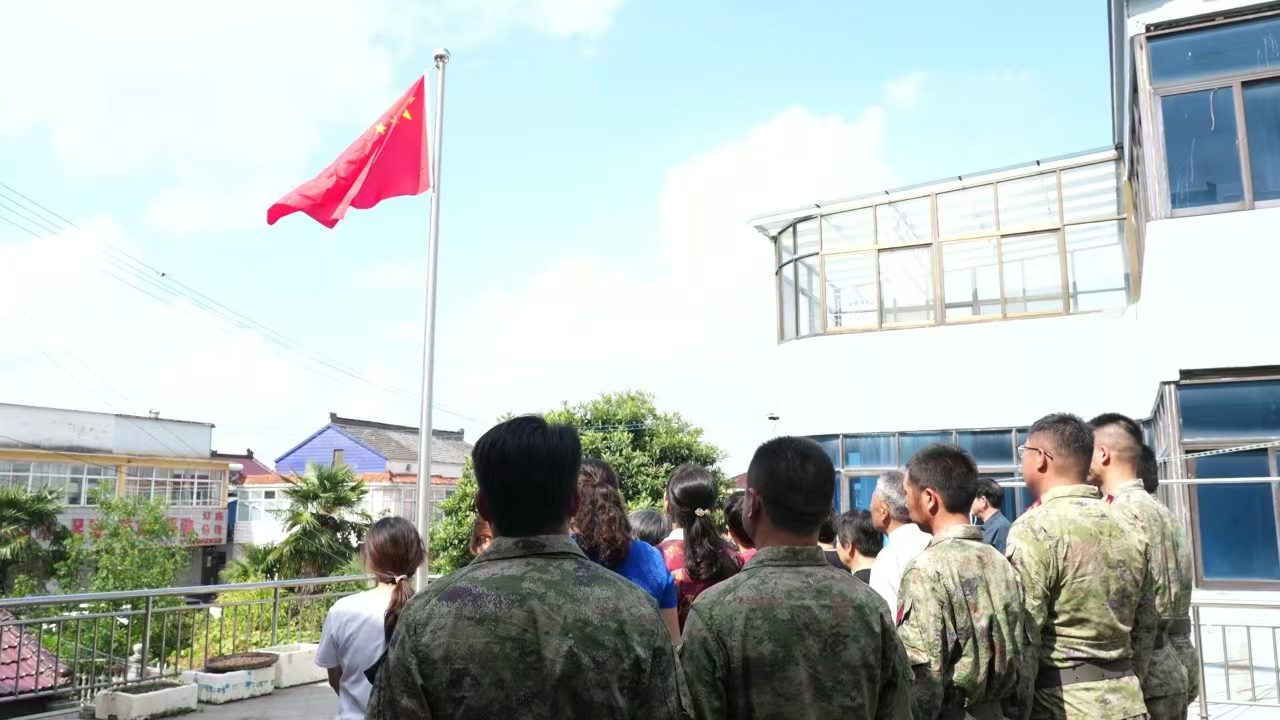 上午9時,吳九成身著紅軍服,在家人的助力下,來到自家庭院里的國旗桿前,將折好的國旗交到兒子和女婿手中。伴隨著國歌聲,兒子和女婿將國旗緩緩升起,吳九成和全家人以及蔣垛鎮(zhèn)部分退役軍人的目光緊緊跟隨著上升的五星紅旗,行注目禮。