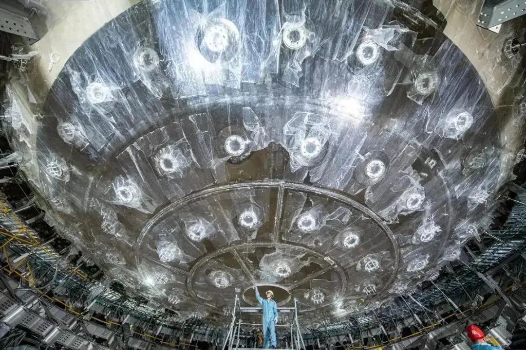 在現(xiàn)場負(fù)責(zé)安裝的湯臣科技項(xiàng)目負(fù)責(zé)人張高峰介紹,玻璃球直徑為35.4米,由263塊厚度達(dá)12厘米的有機(jī)玻璃,從頂端往下逐層拼接而成,成為世界最大的單體有機(jī)玻璃球。此前,國際上最大的有機(jī)玻璃球體在加拿大,直徑為12米。 中國科學(xué)院院士、中國科學(xué)院高能物理研究所所長王貽芳介紹,中微子被稱為宇宙中最古老、最神秘的“幽靈粒子”,其研究對(duì)理解宇宙模型、人類生存的物質(zhì)世界等都具有重要意義,是國際最前沿的基礎(chǔ)研究。