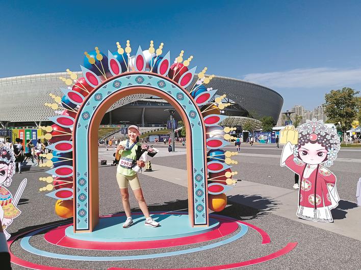 當天上午7點剛過,泰州體育公園,“梅”元素氛圍直接拉滿:公園中心南側,一座華美的鳳冠拱門翩然而起,梅先生曾經塑造過的經典角色,以卡通形象萌立于兩側;移步賽事起點主舞臺,京劇展演鳴鑼開嗓,水袖飛舞,唱腔悠揚;環顧四周,鳳城最動人IP,京劇元素之一的旦角鳳冠,不時在市民、跑友、志愿者頭間躍動。純正的紅、萃美的藍、溫潤的白疊加呈現,在旖旎秋日里閃閃發光。 “能在賽事一線傳遞京劇元素,助力釋放梅郎故里的人文魅力,非常榮幸。”劉小娟來自人才方陣跑團,她第二次參加“泰馬”,“半馬沒中簽,好在還有歡樂跑。戴著鳳冠跑馬拉松,‘泰’好看、‘泰’吉祥了!”幾米開外,青春洋溢的“小水滴”志愿者們,在賽道沿線持花球、彩棒,熱情為健兒們加油、助威。白帽子、紅鳳冠、藍上衣,自成一景。“選手們沖出起點的那一刻,太燃太過癮。”就讀泰州學院大二年級的楊子鈺覺得,能在梅先生的家鄉為“泰馬”喝彩很幸運。