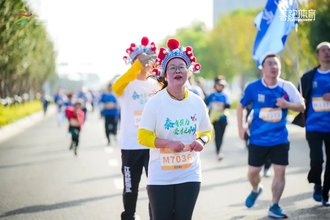 賽事期間,現場隨處可見“志愿紅”。劉桓宇來自泰州學院,她和幾名同學一道成為“領路”志愿者,忙著為參賽選手搬運行李,前前后后跑個不停。為了提供全方位、高質量的服務體驗,泰州團市委、市青志協擴大了志愿規模,聯合了六所駐泰高校、市稅務局、人保財險泰州市分公司和市青年攝影家協會,積極動員并精心組織了這次志愿服務活動。青年志愿者規模由2023年半程馬拉松的1600余名增長至今年的3000多名,總計提供了3800余次志愿服務。此外,還協調了6所駐泰高校,每所學校都派出了50余人的啦啦隊,組建了氣氛組增添人氣,用最美的“泰州微笑”迎接來自五湖四海的跑步愛好者。 賽事亮度 到泰州,戴鳳冠,最吉祥! 秋風又送木樨黃,滿城盡是“鳳冠人”!10月20日,“泰馬”時刻,熱血燃情;頂頂鳳冠,璀璨悅目……今年是京劇大師梅蘭芳誕辰130周年,鳳城泰州將“梅”元素融入馬拉松賽事,向全球跑友生動展現“梅郎故里 戲曲圣地”的非凡魅力。