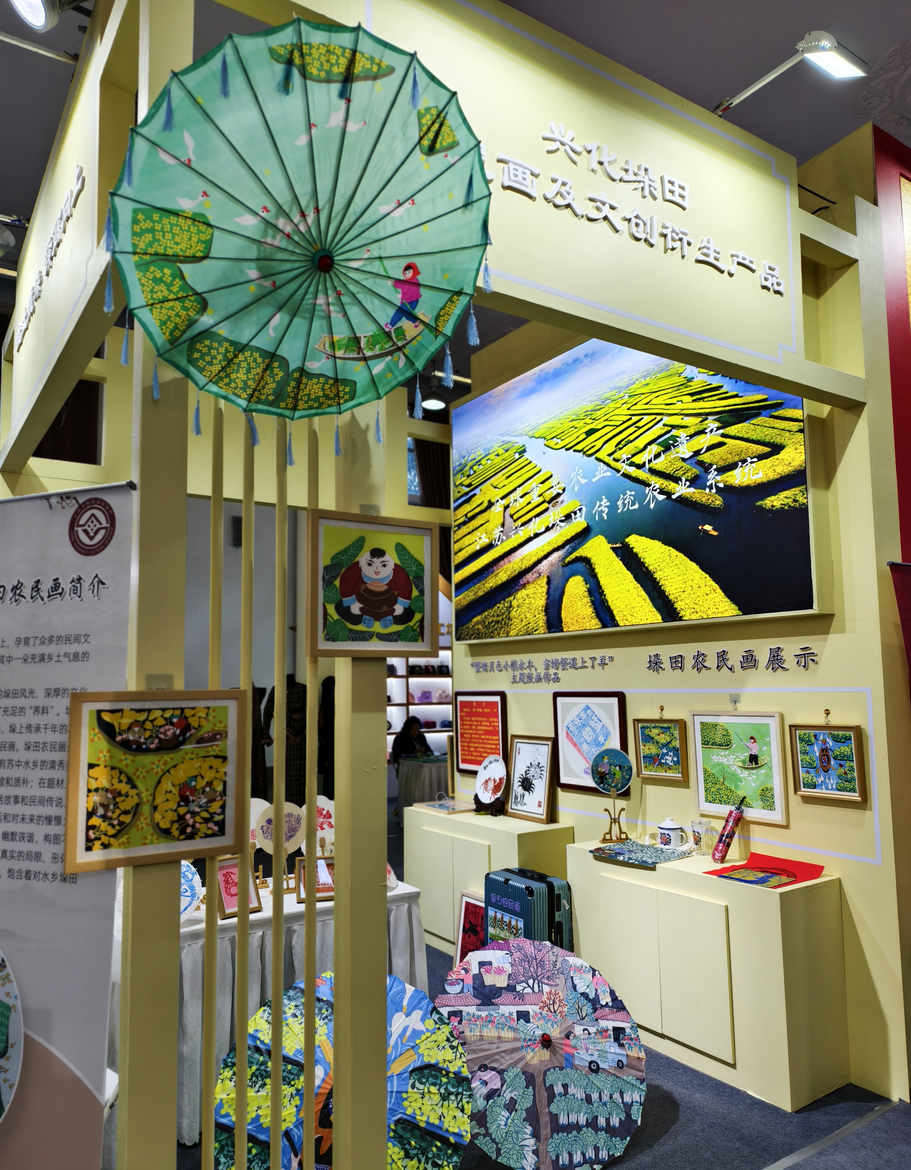 一幅幅農(nóng)民畫,展現(xiàn)全球“農(nóng)遺”的旖旎風(fēng)光、鄉(xiāng)村振興的美好圖景;手提袋、搪瓷缸、手繪團(tuán)扇、流蘇傘等,一個(gè)個(gè)農(nóng)民畫衍生文創(chuàng)產(chǎn)品,讓參觀者愛不釋手……11月21日,在北京全國(guó)農(nóng)業(yè)展覽館內(nèi),興化垛田農(nóng)民畫及其衍生文創(chuàng)產(chǎn)品一經(jīng)亮相,就吸引了眾人駐足欣賞。