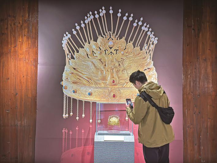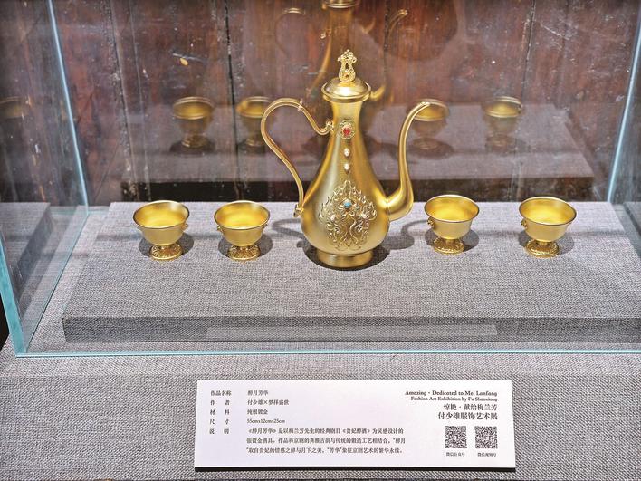 ▲觀眾欣賞《梅韻華冠》,不禁拿起手機拍攝。 本次展覽以現(xiàn)代服飾為載體,將傳統(tǒng)金屬工藝與現(xiàn)代設(shè)計理念相融合,共展出12套別具匠心的藝術(shù)精品,包括鳳冠、酒具、刀劍、茶具、花器、項鏈、云肩、耳飾等門類,付少雄用作品闡釋了他對京劇藝術(shù)的理解和對梅蘭芳大師的景仰。 步入展廳,首先映入眼簾的是一個金燦燦的鳳冠。鳳凰羽翼層疊流動,彰顯出高貴典雅的氣質(zhì),中部龍鳳相融的造型,仿佛在訴說著舞臺上的陰陽調(diào)和、剛?cè)岵。?jù)介紹,這套鳳冠造型作品名為《梅韻華冠》,寓意“梅派”京劇之美輝耀千秋,這是付少雄致敬梅蘭芳先生藝術(shù)精神的代表作,備受觀眾喜愛。旁邊銀鍍金酒具造型的作品名為《醉月芳華》,是以梅蘭芳先生的經(jīng)典劇目《貴妃醉酒》為靈感設(shè)計,將京劇的典雅古韻與傳統(tǒng)的鍛造工藝巧妙結(jié)合。其中,“醉月”取自貴妃的情感之醉與月下之美,“芳華”象征京劇藝術(shù)的繁華永續(xù)!对菩滹L(fēng)華》以梅蘭芳京劇服飾為靈感,在云肩中融入了細(xì)膩的刺繡工藝,每一針每一線都透著靈動與韻律,呈現(xiàn)出京劇服飾的優(yōu)雅與華貴。