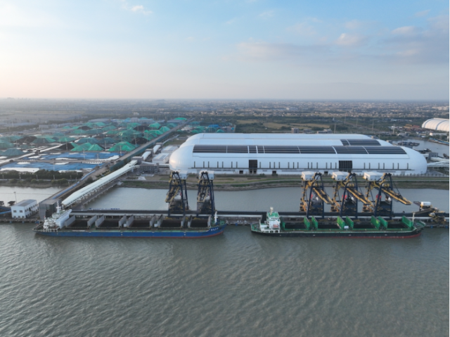 深國際靖江港總投資額22.8億元,主營煤炭、礦石、石油焦等貨種,著力打造長江沿線綠色、智慧、高效、安全的現代化示范港。作為長江干線泊位等級最大的散貨港口之一,深國際靖江港建有2個10萬噸級散貨泊位、5個3000噸級內港池散貨泊位,一次性堆存能力可達120萬噸,設計年吞吐量超4500萬噸。該港于今年5月18日開港。作為長江沿線港機配置效率最高的煤炭散貨港口之一,該港口進場、過駁、出場峰值達9000噸/小時。港口首創長江沿線連跨式鋼結構全封閉大棚,充分利用封閉大棚屋面及皮帶機廊道屋面建設光伏發電站,多措并舉打造“綠色近零碳港口”。