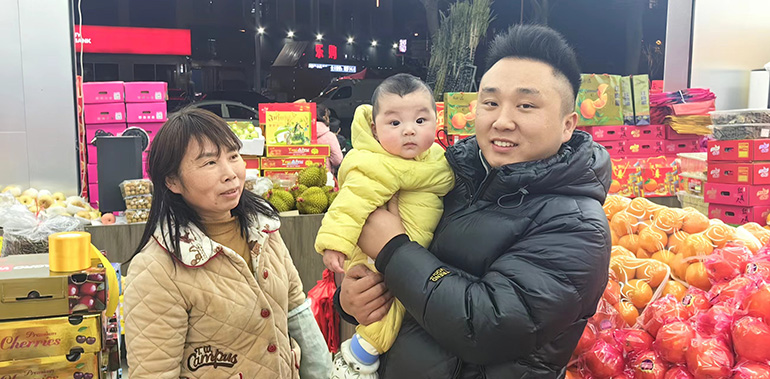 “每逢節假日就是我們最忙的時候。”公司總經理童斌表示,蛇年春節不歇機不停產,保障產品當日上市。今年47歲的童斌老家在淮安,為確保一季度開票銷售2億元的目標,凈化加工車間和蜂窩鍋生產線全員在崗,他把兒子和父親從老家接到了公司,與他們夫婦一起在姜堰過春節。 “我們公司日產量大概在4噸以上,每天禮盒生產量約500多件。采用先進的生產工藝,保證了牛肉和豬副的營養成分及口感,讓消費者品嘗到最新鮮的美食。”凈化加工車間負責人吳永海說,公司有6名外地員工留守春節崗。 來自四川瀘州的倉庫管理員鄭忠海,排班到正月十五,準備節后回四川休假,他說:“2022年來到姜堰,負責公司線上線下發貨,月收入8000元,節日服務更要講誠信,我得堅守崗位。” 童斌表示,新一年,企業擴能升級快馬加鞭,年前新建了12畝的活牛屠宰中心,2025年將新建40畝新廠區,可以吸納200人就業,預計全年實現開票10億元。 水果“迎春”,十家店一家人 1月26日晚,姜堰區殷唐路上燈火通明,時針過了9點,水果店店主李丹峰才捧起晚飯碗,他說,進入臘月二十以來,每天水果能賣近萬元,現在,已經備足20多萬元貨源以應節日之需。