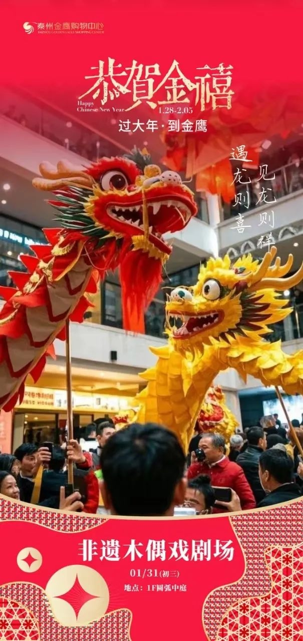 1月29日 14:00舞龍迎新春;1月30日至31日14:00/15:00/16:00/17:00有非遺皮影劇場;2月2日10:18財神駕到新春巡游,14:00有非遺武術表演;1月29日至2月2日14:30有年趣親子嘉年華活動,大人小朋友一定會玩得其樂融融。 ![]() 春節期間,鳳城・悅天地將為市民帶來一場精彩紛呈的節日盛宴。每周六、日,靈動的魚燈與特色獸裝巡游表演將穿梭于街區,為您帶來別樣趣味;初一至初五,熱鬧非凡的舞龍舞獅迎財神活動,帶您感受傳統佳節的喜慶氛圍。 春節期間各商場營業時間