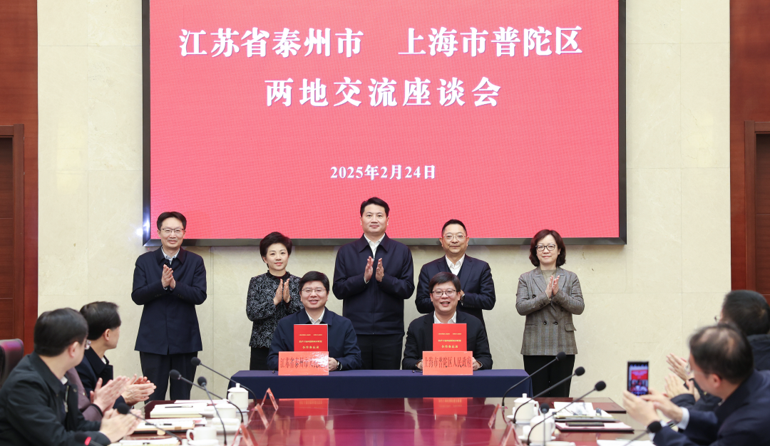 2月24日下午,上海市普陀區(qū)黨政代表團(tuán)來泰州考察,泰州市政府與普陀區(qū)政府簽署沿滬寧協(xié)同創(chuàng)新城市聯(lián)盟合作備忘錄,進(jìn)一步拓展合作廣度深度,合力譜寫高質(zhì)量發(fā)展新篇章。泰州市委書記姜冬冬,市委副書記、市長萬聞華與普陀區(qū)委副書記、區(qū)長肖文高一行座談。