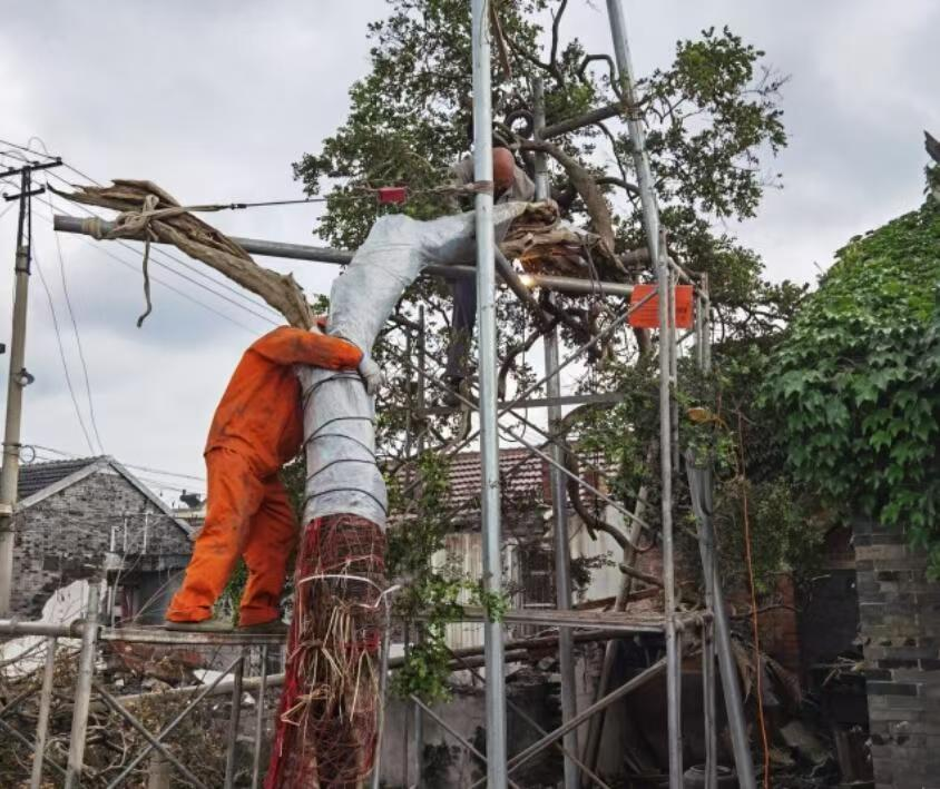 抓生態(tài)文明建設必須搭建好制度框架,抓好制度執(zhí)行。姜堰區(qū)出臺了古樹名木保護的政策文件,并用現(xiàn)代新手段,為每株古樹名木辦理了“身份證”、建立電子檔案,成了姜堰區(qū)古樹名木的新配置,每株古樹名木代表著“姜堰戶籍”,賦予它們與當?shù)鼐用裣嗤臉s譽和責任。 張勝說,實行身份化識別管理,能夠及時對古樹名木生態(tài)環(huán)境、生長發(fā)育和保護進行動態(tài)監(jiān)測,便于對長勢衰敗的“一樹一策”制定保護措施。 泰州市姜堰區(qū)顧高鎮(zhèn)野莊村有株千年古黃連木,樹高14.8米,胸徑109.8厘米,冠幅11米,是省內少見的高齡黃連木古樹。由于樹體的老化和自然環(huán)境等因素的影響,這株古黃連木長勢衰敗。2021年6月,姜堰區(qū)與省林科院聯(lián)手成立專門復壯團隊,先后三次實施保護復壯工程,分別從清腐防腐、支架改造、改善周圍生長環(huán)境、病蟲害防治以及其他輔助措施等方面進行技術保護復壯。如今,古黃連木已重新煥發(fā)生機,古黃連木在專業(yè)團隊呵護下,實現(xiàn)“老有所養(yǎng)”。