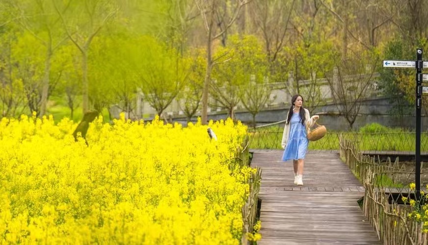 三月的姜堰,被金色點燃。溱湖濕地、河橫村等地,數萬畝油菜花競相綻放,宛若被潑色的“油畫”。游客登上觀景臺,或漫步花間棧道,感受蜂蝶引路的野趣。漢服愛好者穿梭河橫花田拍攝古風片,親子家庭參與農事研學、手作風箏制作,攝影達人捕捉“最美春色”;êV苓呥設有田園市集,菜籽油、草雞蛋等農特產與花香交織,繪成鄉村振興的鮮活圖景。