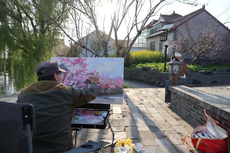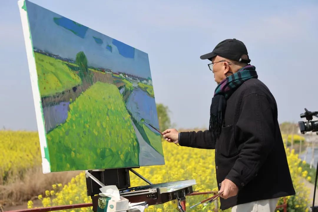 4月3日,天氣晴好,漫步東羅村,處處皆成畫卷:蜿蜒的村道旁,白墻黛瓦的民居與碧水相映成趣;轉過一道彎,金黃的油菜花田與古樸的石橋構成絕妙景致,真正是“一步一景,移步換景”的絕佳寫照。一級美術師、中國寫意油畫研究院院務委員唐滿生不禁感嘆:“泰州勝江南!從前總以為小橋流水、煙雨朦朧的景致只能在江南得見,沒想到在泰州,也能看到這江南的水鄉韻味。” 望著眼前層疊的千垛花田,中國美術學院教授、浙江省油畫協會副主席章曉明更是直言:“景色太美、太多,畫不完!根本畫不完!”畫至酣暢處,他索性邀來正在旁側服務的泰州市青年美術家協會副主席張昇一同作畫。