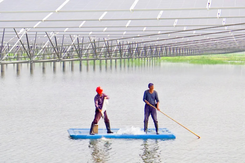 近日,泰州市海陵區(qū)在項目建設(shè)上持續(xù)發(fā)力,罡楊鎮(zhèn)純垛村170畝“漁光互補(bǔ)”項目實現(xiàn)并網(wǎng)發(fā)電,同步開啟“水上發(fā)電、水下養(yǎng)魚”的立體發(fā)展模式,迎來重要節(jié)點。 “前段時間我們投放了鳊魚和河蝦,河蝦預(yù)計國慶節(jié)就能捕撈上市,整個魚塘的畝均收入較以前能增加1000多元。”養(yǎng)殖戶陳華良提到,光伏板下的魚塘租金只有以前的三分之一,大大降低了養(yǎng)殖成本。