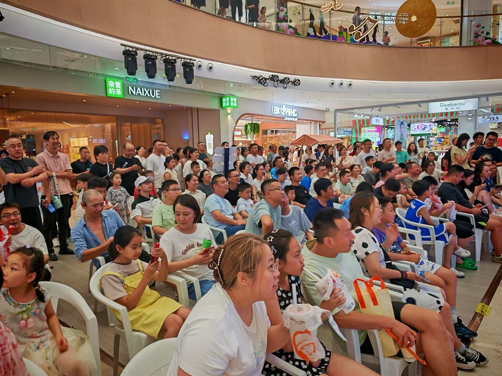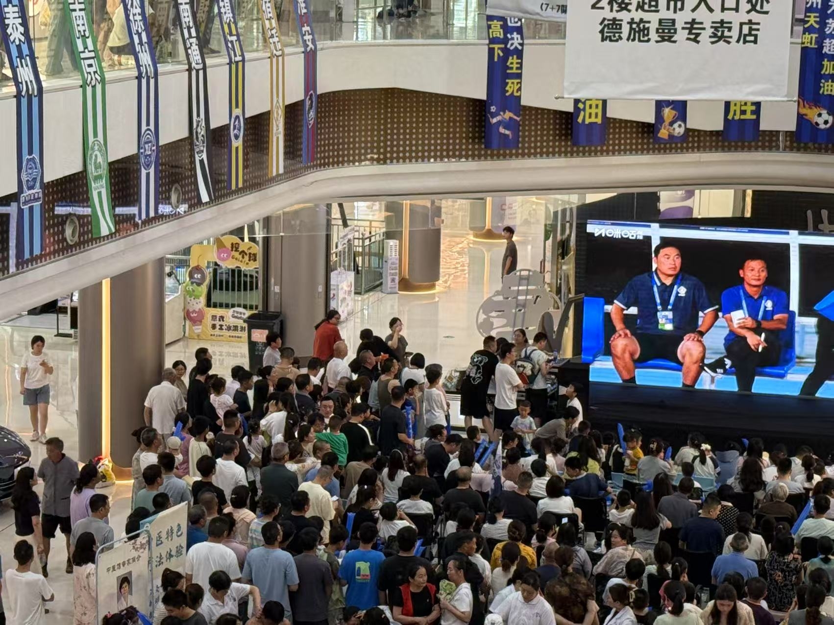 泰州萬象城戶外廣場,不僅巨型電子屏幕前圍滿人,沿街商鋪門口也站滿球迷。大家手舉應援棒,匯成聲勢浩大的“藍海”。泰州天虹購物中心精心準備了生日蛋糕,慶祝泰州市、宿遷市建市29周年。 京泰集市滿滿的煙火氣里,200多位市民與體育愛好者圍坐大屏前,啤酒杯清脆碰撞,整條街市成了搖旗吶喊的舞臺。 泰州天虹購物中心則在觀賽區域一側設置“綠茵狂歡夜 中醫康養集”主題中醫夜市。來自野徐鎮衛生院的多位中醫、護理專家,為球迷把脈、辨識體質,并提供健康咨詢,現場還有艾灸、拔罐、推拿、耳穴貼壓等適宜技術體驗,以及常見中藥材科普、中醫啟蒙游戲、趣味答題等活動,深受大家歡迎。