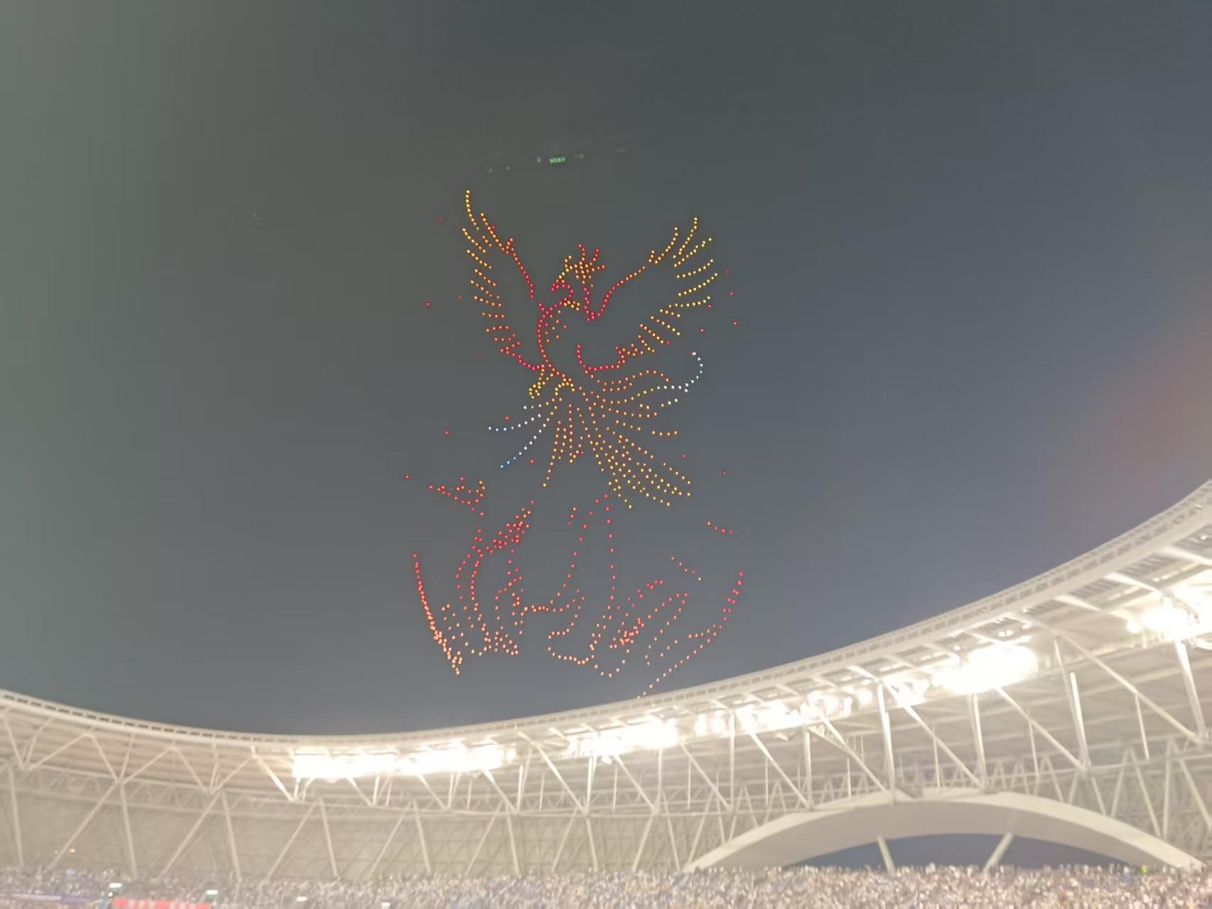 夜空中悄然升起800架無人機,它們先是聚成一只展翅高飛的鳳凰,羽翼流光溢彩,將泰州“鳳凰城”的祥瑞寓意與足球運動的激情完美融合。緊接著,泰州11號球員巴特經典的“倒掛金鉤”射門動作躍然夜空,引發球迷陣陣歡呼。最有趣的莫過于泰州早茶與宿遷白酒的“代言小人”隔空對踢,憨態可掬的互動形象,讓觀眾忍俊不禁。“今晚不僅看了球賽,還‘吃’了早茶、‘看’了京劇、‘逛’了水滸,值!”宿遷球迷曹宇說。 “泰周到”護航賽事全程 當晚,市紅十字應急救援隊、海陵區紅十字應急救援隊共60人參與賽事保障,紅白相間的身影遍布觀眾席、賽場通道等區域,時刻準備應對突發狀況。